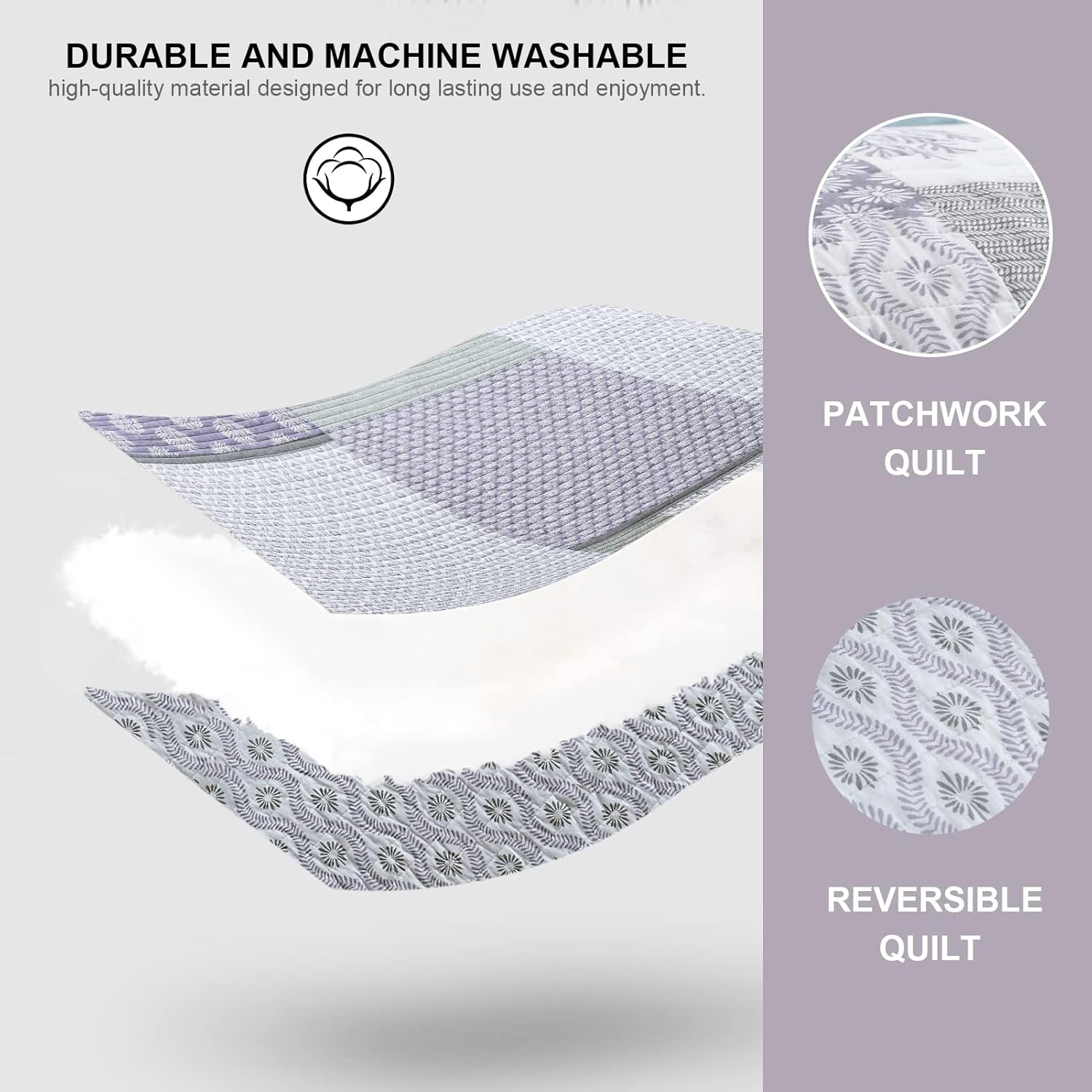 PANGUSHAN Quilt Set Queen Size, 100% Cotton Bedspread Quilt Bedding Set, Patchwork Reversible Floral Quilt for Queen Bed, Purple/Grey/White Bed Spread, Lightweight Comforter for All Season, 3 Pieces