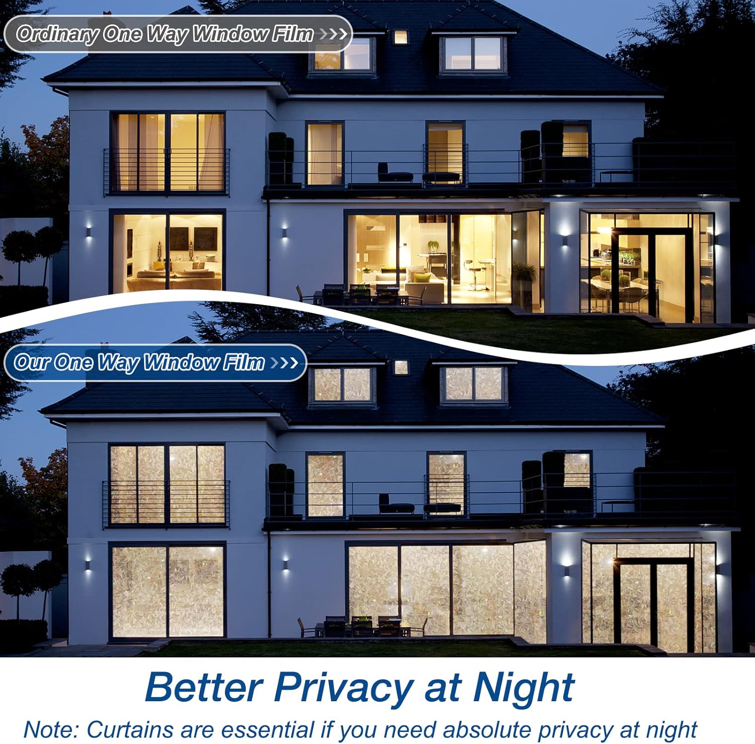 - One Way Effect: Our reflective window privacy film see out not in only provides great privacy during the daytime. Conversely, the privacy effect will be reversed and the inside can be seen from the outside during the night. Remember to draw curtain during night. The side with the most light will be opaque appearance