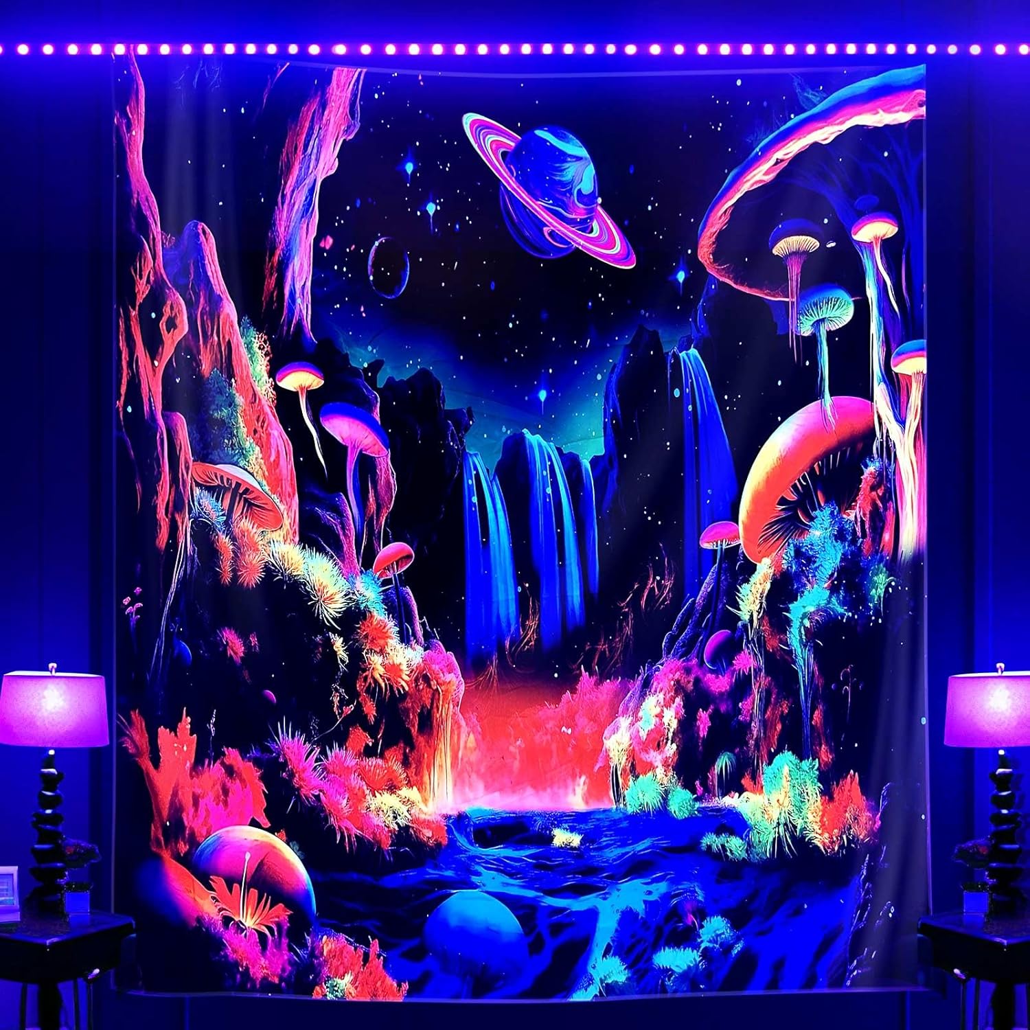 ADDWel Blacklight Mushroom Planet Tapestry, Black Fantastic Tapestry Glow In The Dark, UV Reactive Black Light Posters Wall Hanging for Bedroom Dorm Living Room Backdrop Decor