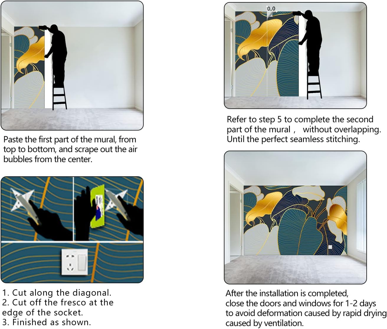 - It's easy to install: at the bottom of each mural we have a numbered sequence, You can refer to the instructions we provided and the main picture 6-7,just match the numbers and you'll be amazed!