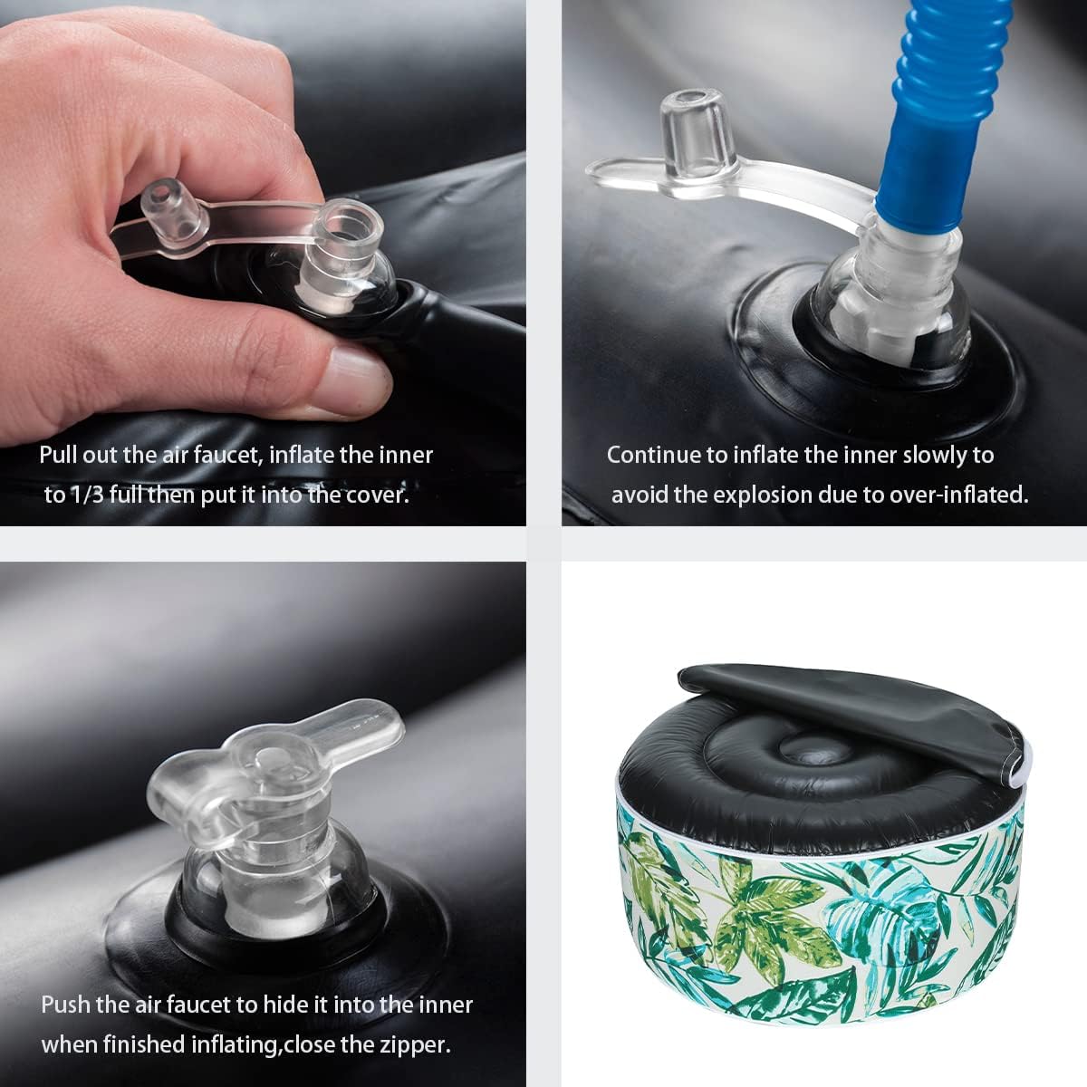 - ăDurable Outdoor Materială-Inflatable ottoman cover made from durable, waterproof material that can withstand exposure to all weather. Fade-Resistant keep its original color and pattern even if exposed to the direct sunlight for over 500 hours. The black inner made of waterproof thick PVC fabric that can bear up 300 lbs.Very easy to clean and maintain.