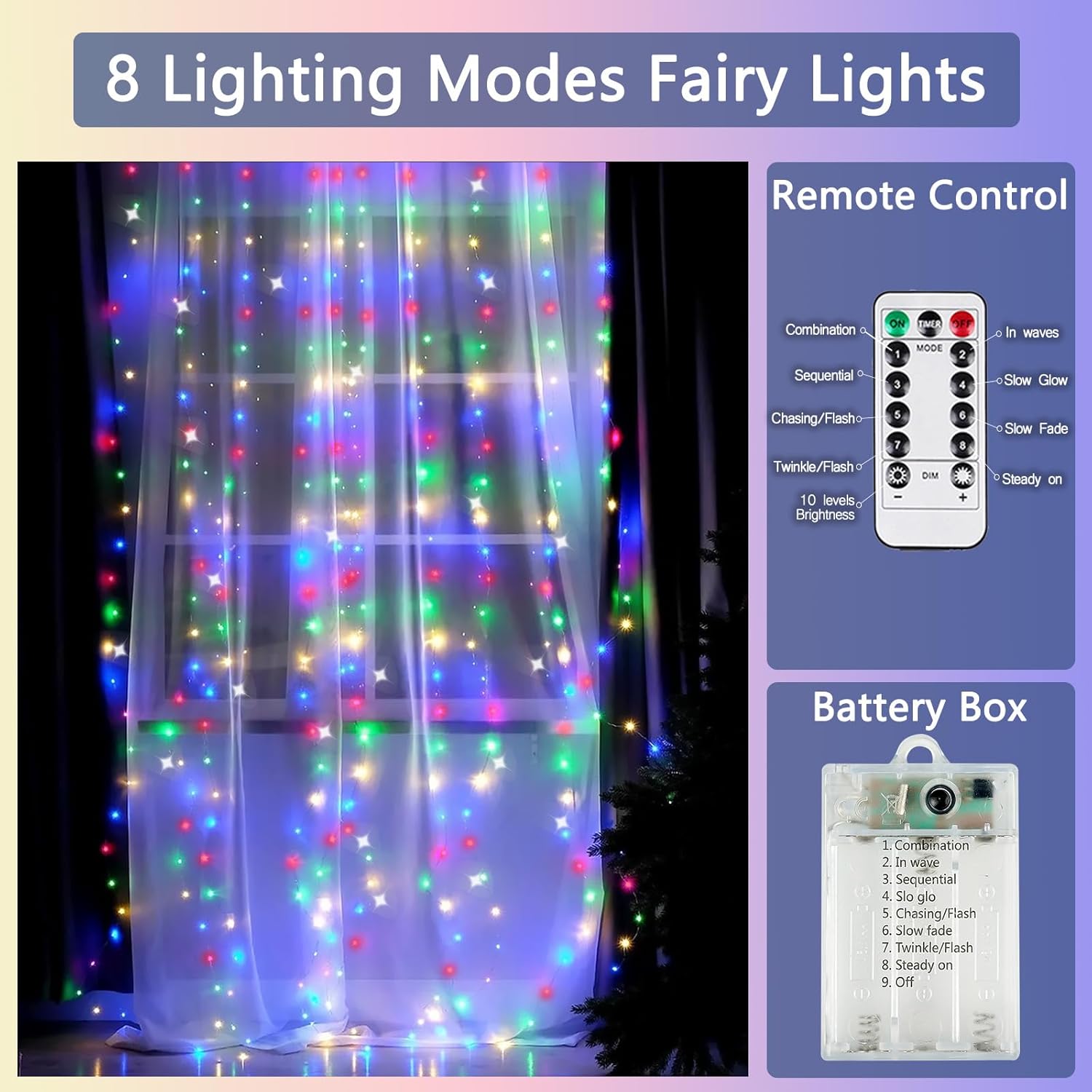 - Colorful Lights Battery Operated: Made with ultra-bright LED and durable silver-coated copper wire and battery box, the fairy lights will be an ideal choice for your home decor. Each set contains 4pcs of string lights and 2pcs of remote controls. Each String light length is 26ft with 80 LED (AA battery case, batteries not included.)