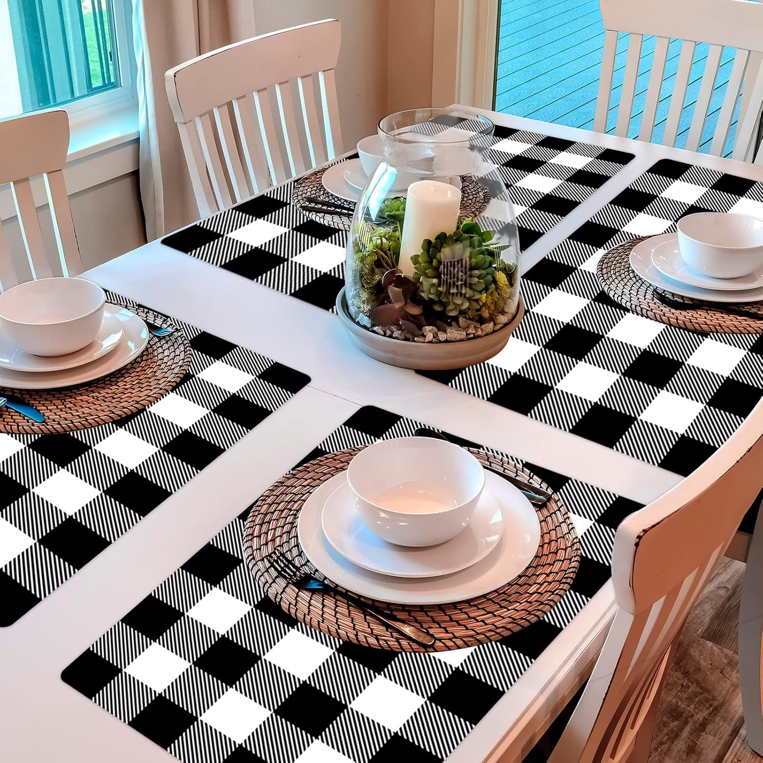 - 【Eye-Catching Design】Elevate your black and white themed dining experience with our buffalo plaid placemats! The design of the black and white placemat incorporates classic elements of the black check plaid. Buffalo Plaid placemats add a touch of brilliance to your table setting. Impress your guests and create an unforgettable cheerful atmosphere for your party.