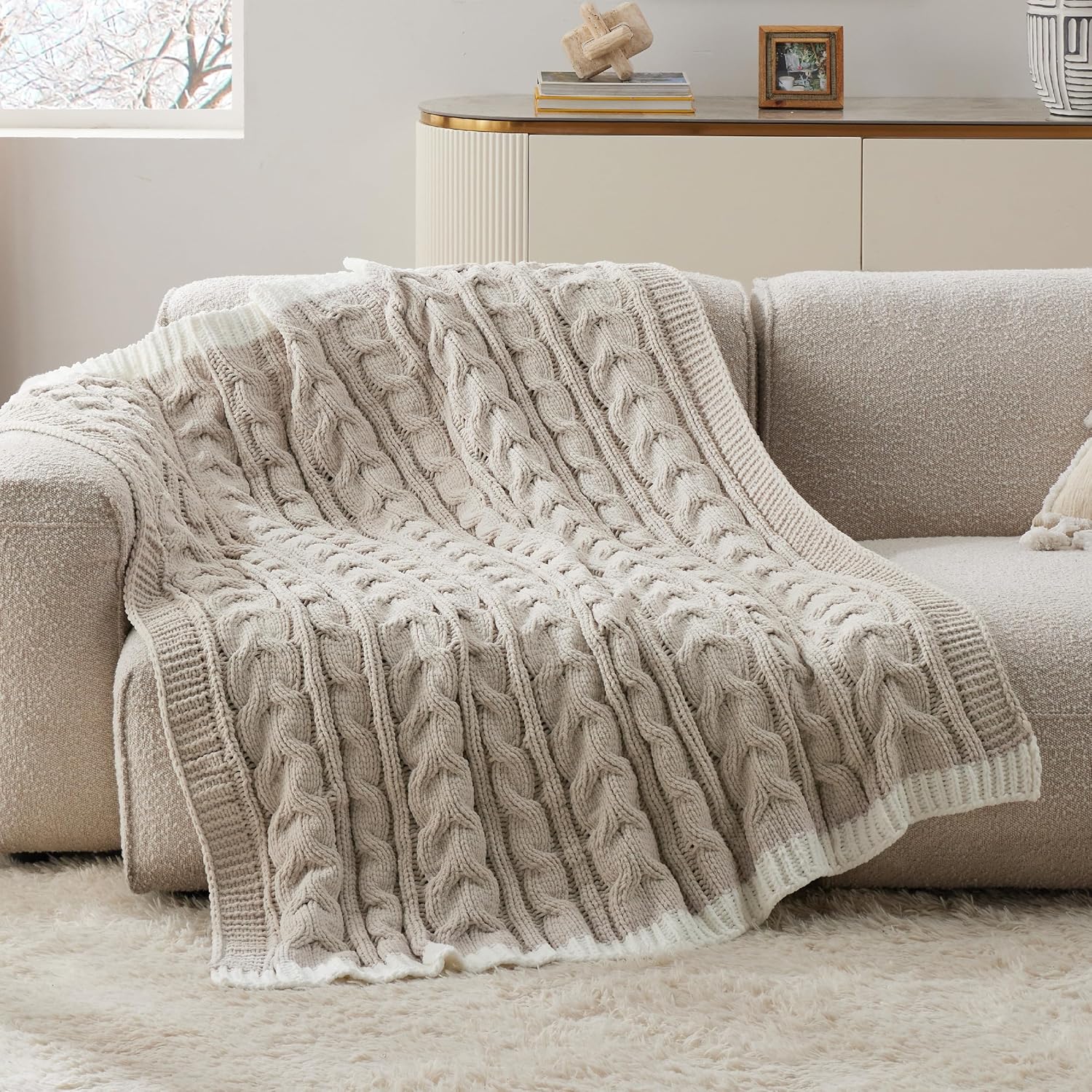 Bedsure Cable Knit Throw Blanket for Couch Bed - Breathable Chenille Chunky Knit Throw Blanket for Decorative Gift, GentleSoft Cozy and Warm for Winter and All Seasons, Beige, 50x60 Inches
