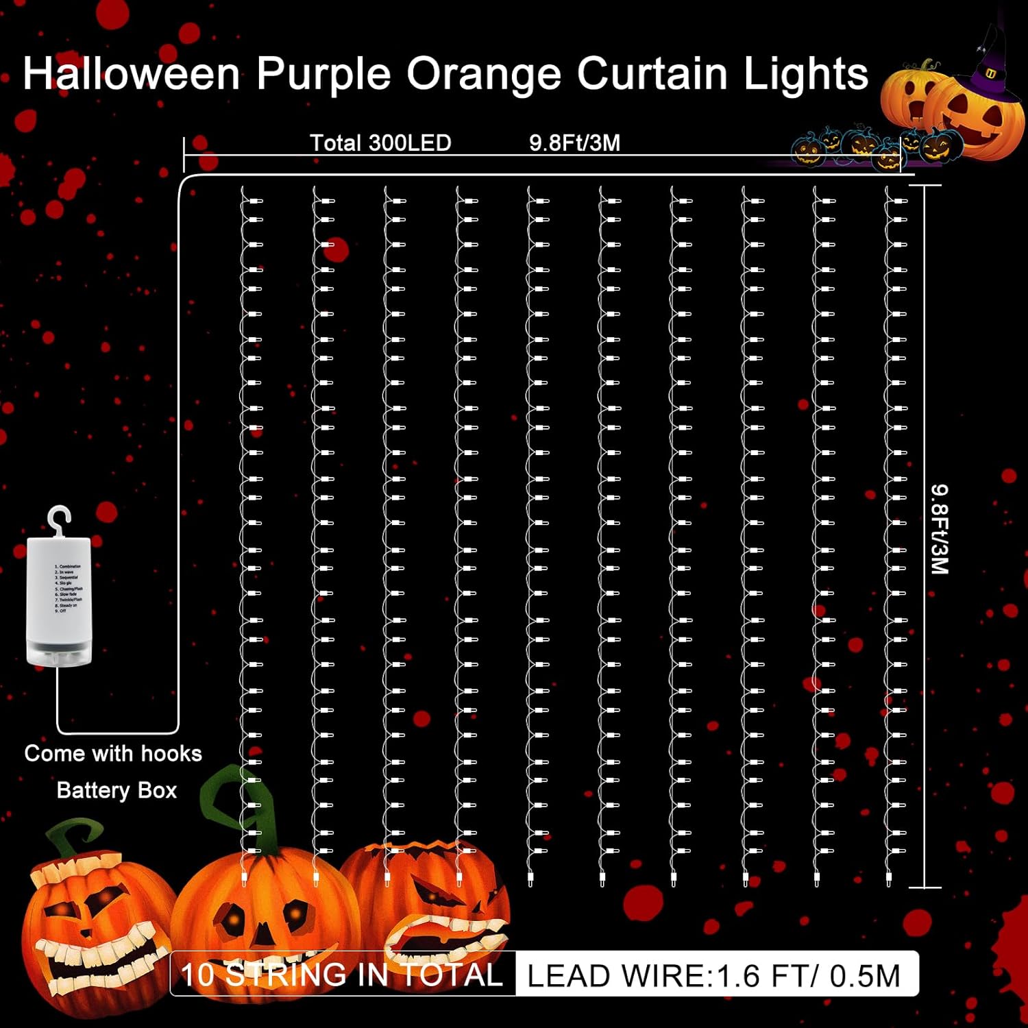- Purple & Orange Halloween Lights: 300 LED string curtain lights, 9.8ft x 9.8ft hanging lights with remote control for Halloween decor
