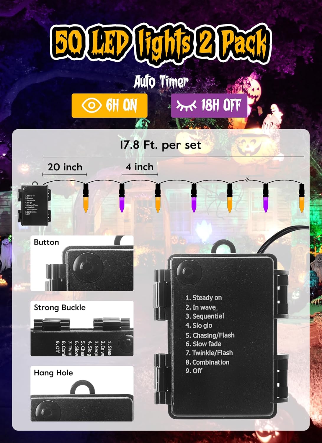- 【Timer Lighting】Press the button on the halloween lights battery case to power on, and to activate 6 hours lighting and 18 hours off mode, no worrying about forgetting to switch off the lights, 20000 hours LED lifespan for endurable operation