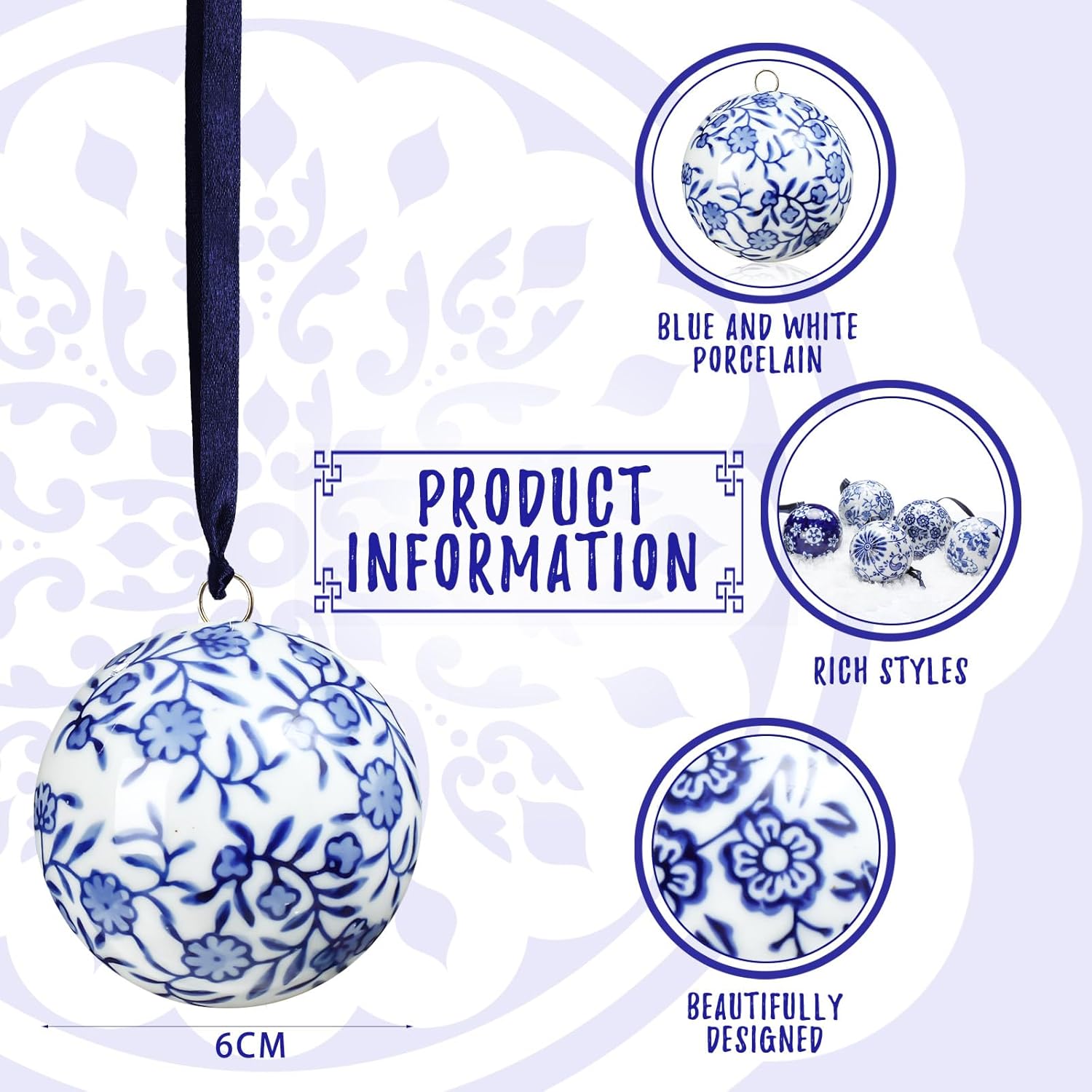 Cindeer 6 Pcs Blue and White Christmas Porcelain Balls 2.4 Inch Porcelain Chinoiserie Ornament Bulk Christmas Ceramic Hanging Decorative for Tree Home Xmas Party (Classic Style)