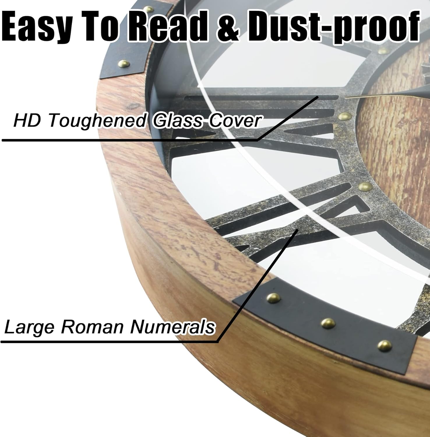 - đ§ăOversized Clock and Silent Movementă This giant rustic wall clock measures 30" (76CM) in diameter, 3.15'' (8CM) in depth, weight-12.56lbs (5.7kg), huge size and heavy duty. Using high quality quartz movement material to run smoothly, ensuring accurate timing and absolute silence. Big Roman Numerals, HT toughened glass cover, you can easily read the time from any angle.