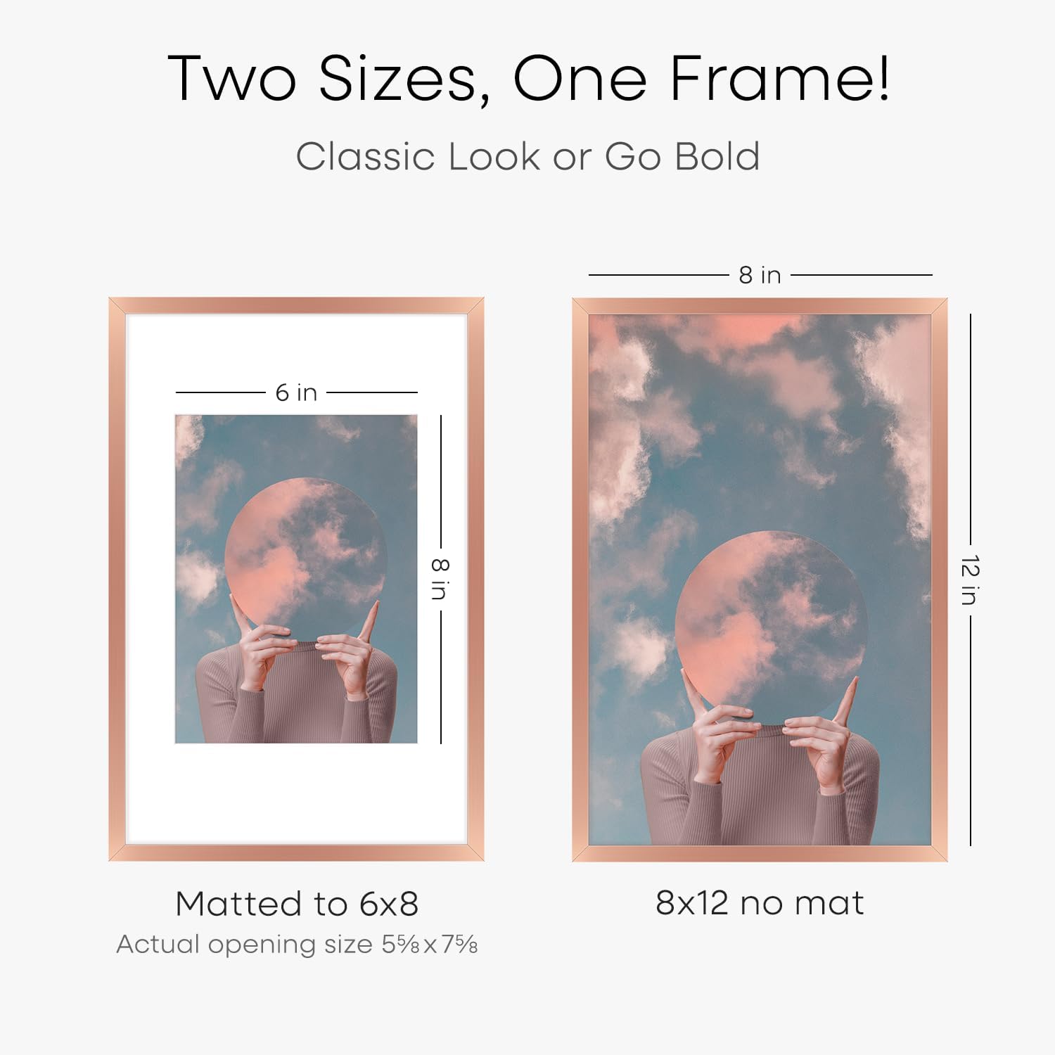 Homeforia 8x12 Picture Frame Rose Gold, High End Metal 8 x 12 Poster Frames with Mat 6 by 8 Photo, 12x8 Frame Matted to 6x8 inch Print, 8by12 Wall or Tabletop Frame, Tempered Glass, Wall Kit, Set of 1