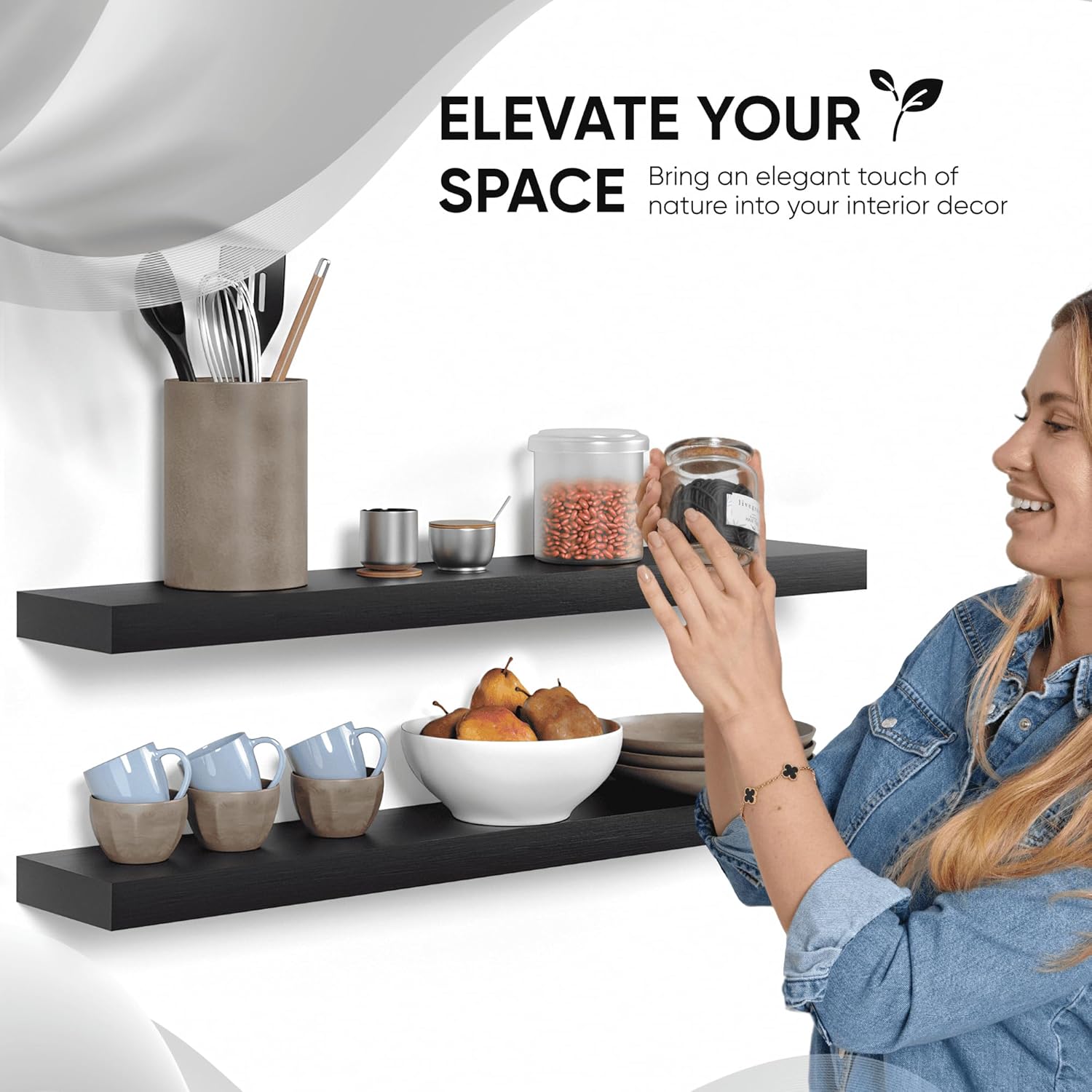 Homeforia Black Floating Shelves 36 inches Long, High End Solid Real Wood 36 inch Floating Shelf for Wall Mounted, Black Wooden 36in Floating Shelves, Heavy Duty Bracket, 36 X 6.5 X 1.75 in, Set of 2