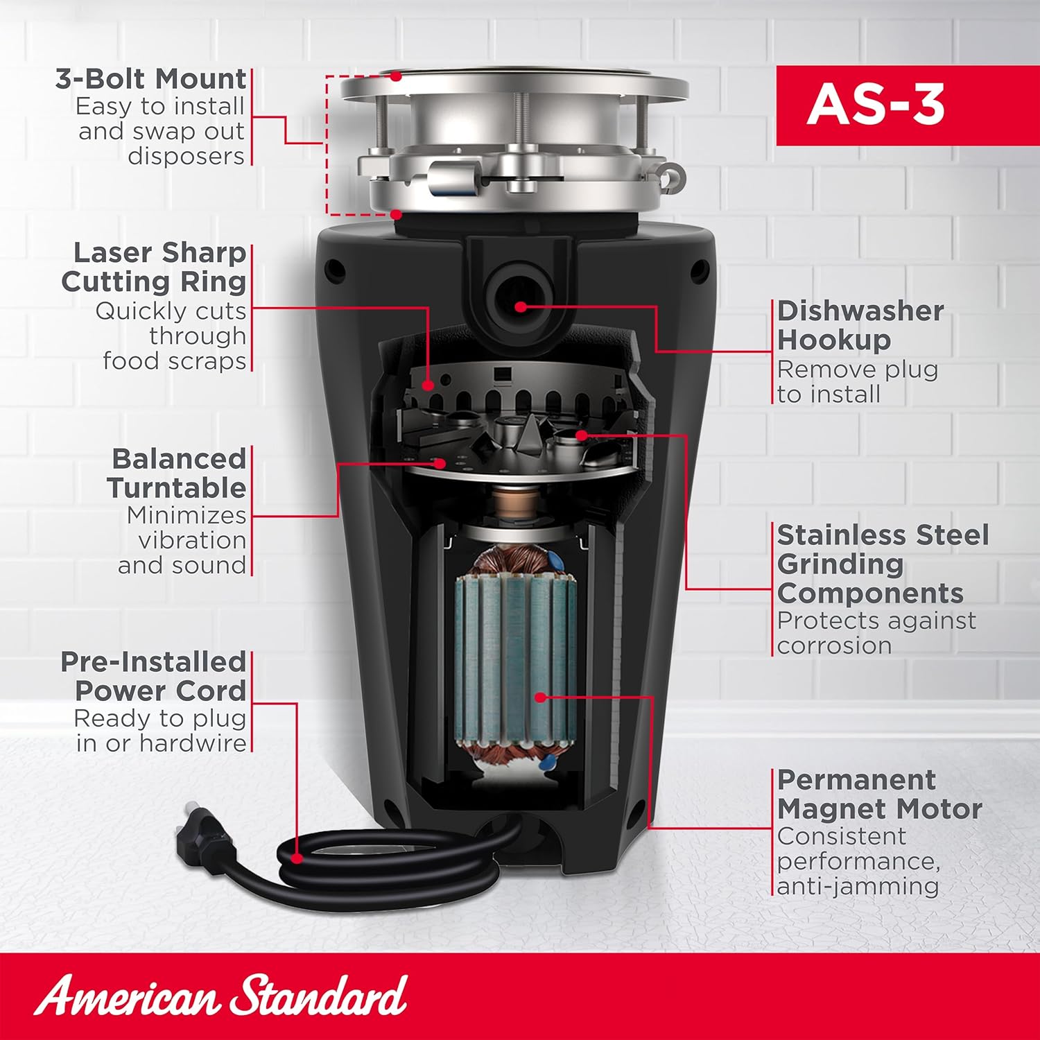 American Standard 10-US-AS-3 Garbage Disposal Anti-Jam Stainless Steel Food Waste Grinding System, Slim Line, 1/3 HP, Black