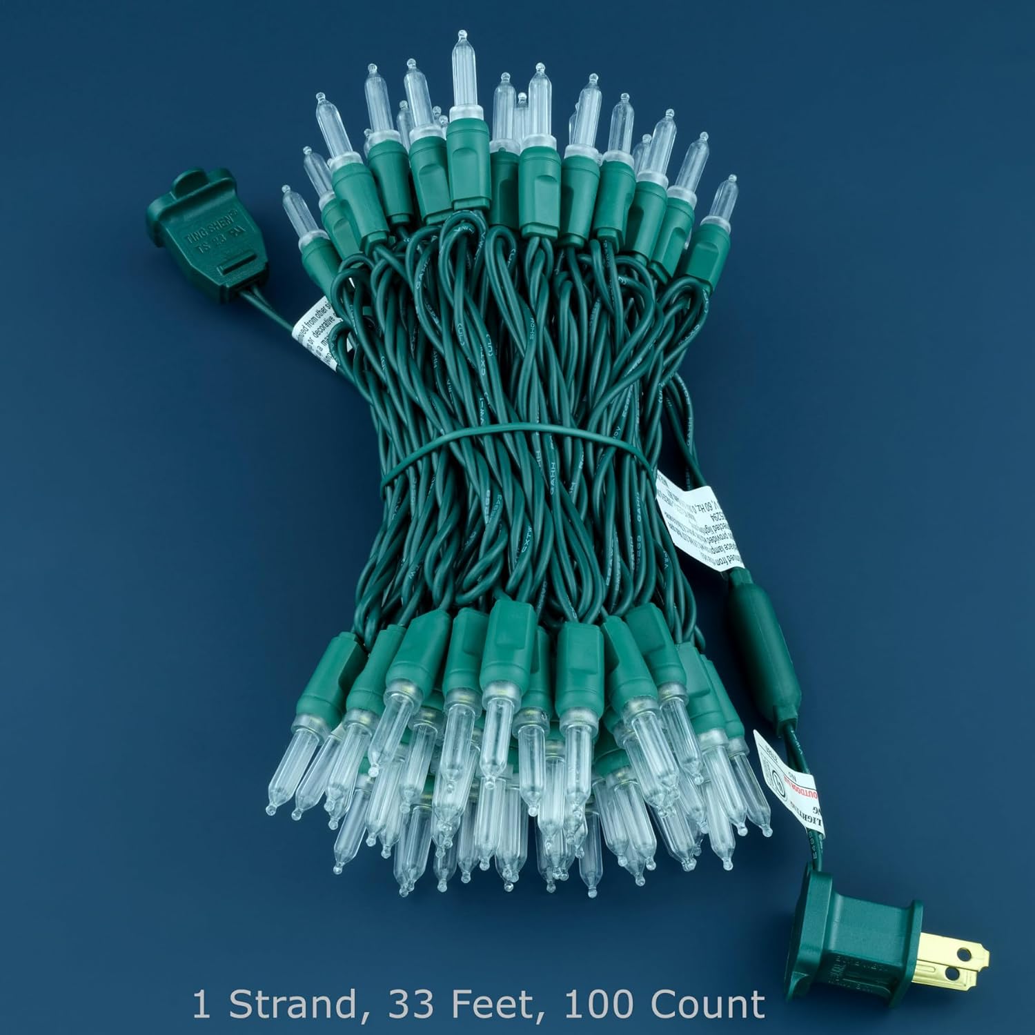 - SPECIFICATIONS ☀ Each pack contains 1 strands of one-piece string lights, total length 33 feet with 100 count cool white mini lights. 22 AWG green cord, 4" lead, 4" spacing, 4" tail.