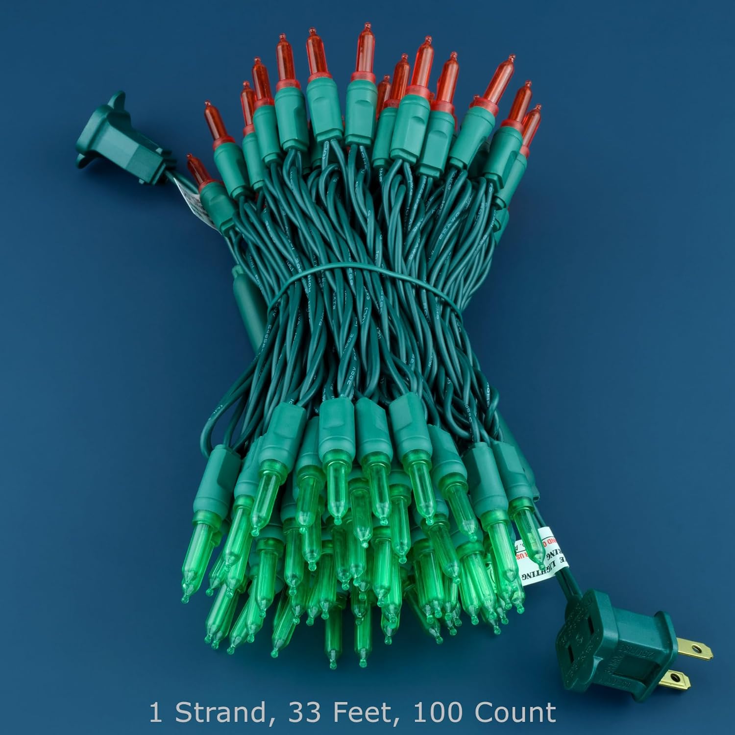 - SPECIFICATIONS ☀ Each pack contains 1 strands of one-piece string lights, total length 33 feet with 100 count red-green interval mini lights. 22 AWG green cord, 4" lead, 4" spacing, 4" tail.