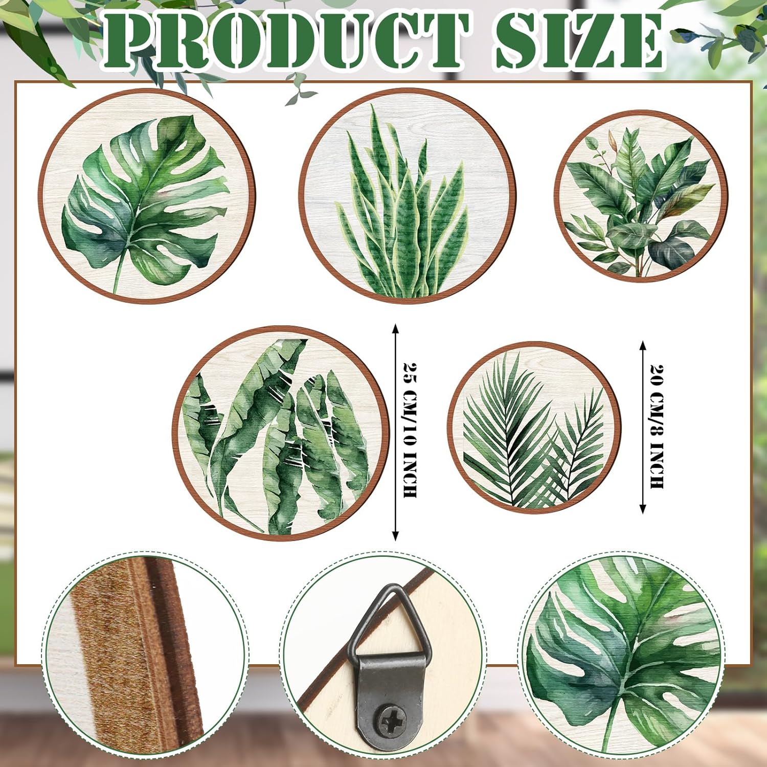 - Proper Size for Display: there are 2 kinds of sizes of the aesthetic wall art, 3 bigger ones measure about 10 inches/ 25 cm in diameter, and 2 smaller ones are about 8 inches/ 20 cm in diameter, all of them are about 0.2 inch/ 0.5 cm in thickness, proper size to catch people's attention