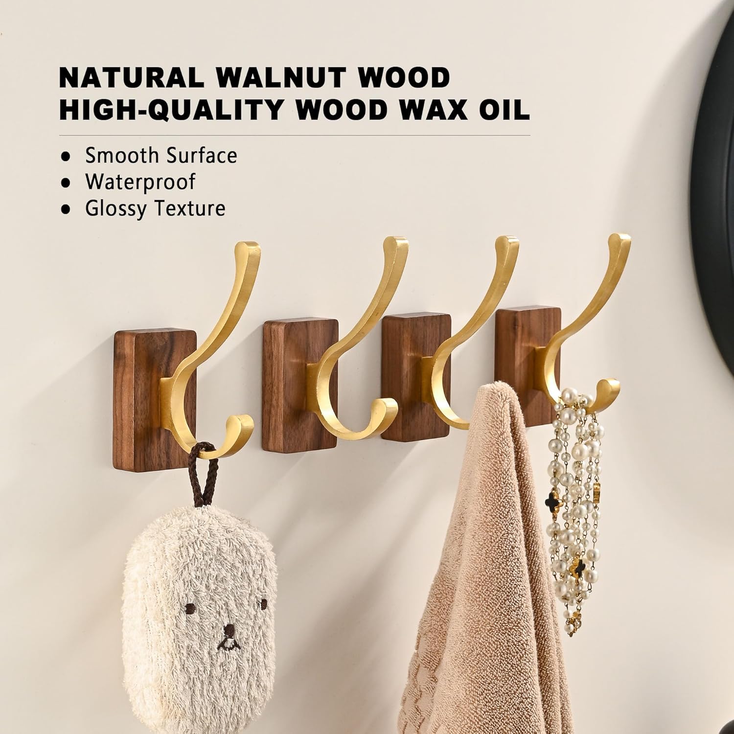 4 Pack Wooden Wall Hooks for Hanging, Adhesive Mounted & Wall Mount Nature Wood Coat Hook for Towel Clothes Blanket Hat Backpack Robe Nursery Door Board Entryway Key Holder Brushed Gold