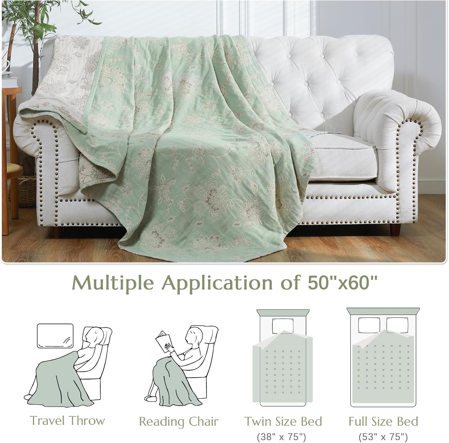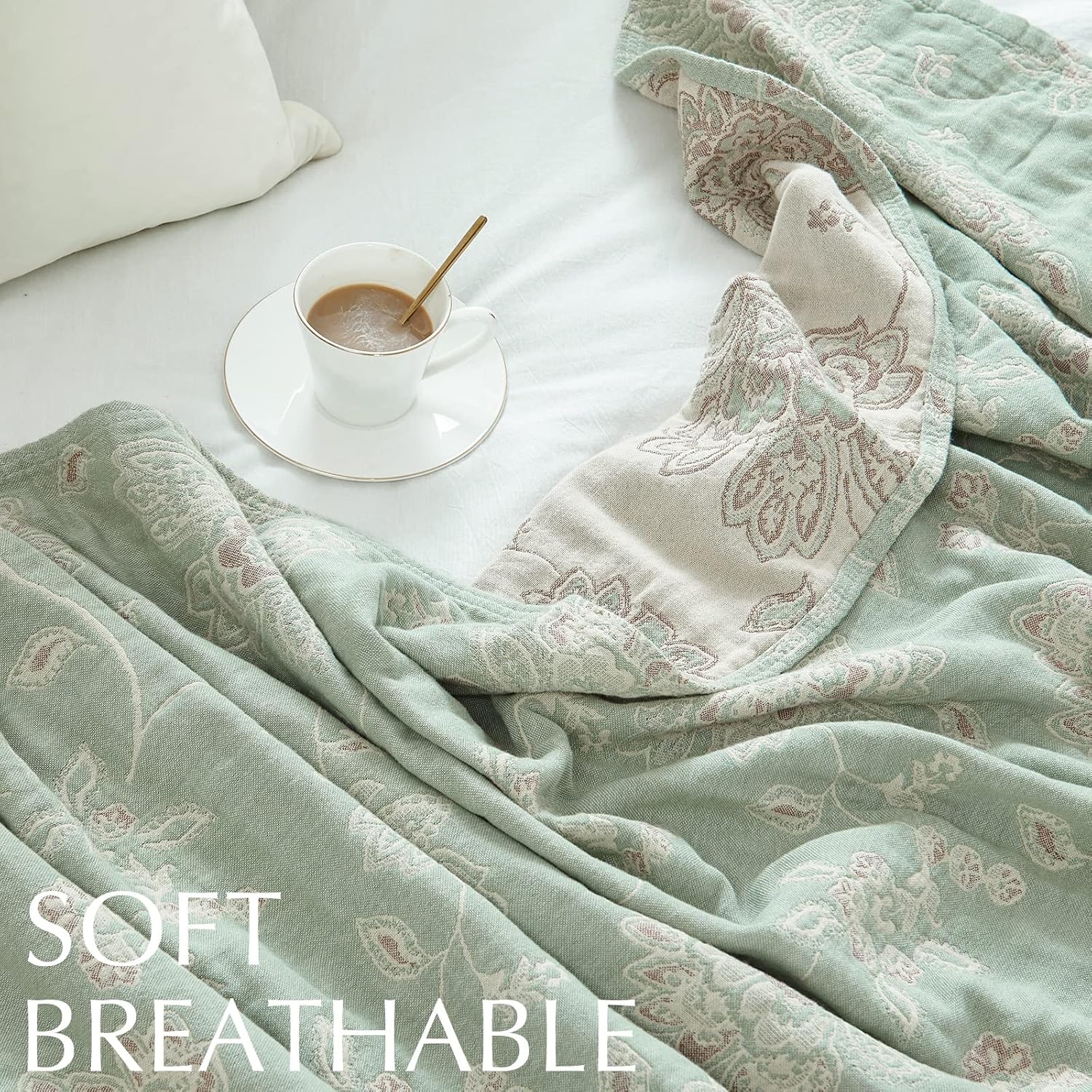 jinchan Boho 100% Cotton Muslin Twin Size 50x60 Inches Blanket Lightweight 4-Layer Quilted Soft Green and Beige Floral Throw Blanket Reversible Comfy Flower Breathable All Seasons Couch Bedroom Decor