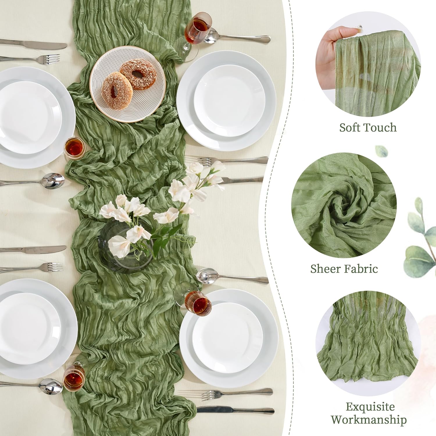 - PACKAGE INCLUDED: You will receive 6 pieces of sage green cheesecloth table runners. Elegant and beautiful design, exquisite workmanship. Product size: Each boho table runner is 35 x 120 inches. Enough to cover rectangles and round tables, as well as long tables that are stitched together. It can even be used to belt chairs decorate table napkins, background curtains. Round or square tables for 8-10 people, perfect for romantic and elegant party events