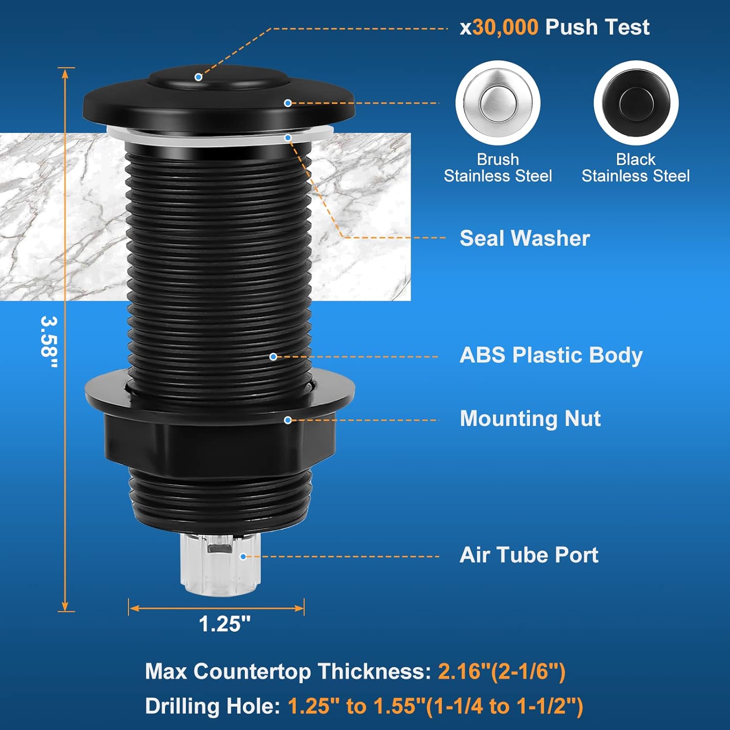 - Wide Compatibility: The air switch button is 3.58” long, which fits any stainless steel sinktop and thicker countertops, like marble, quartz and granite, much wider applicable than those short 2.5” ones for stainless steel countertop only.It perfect fit for most brand or model of garbage disposers(≤2.5HP).