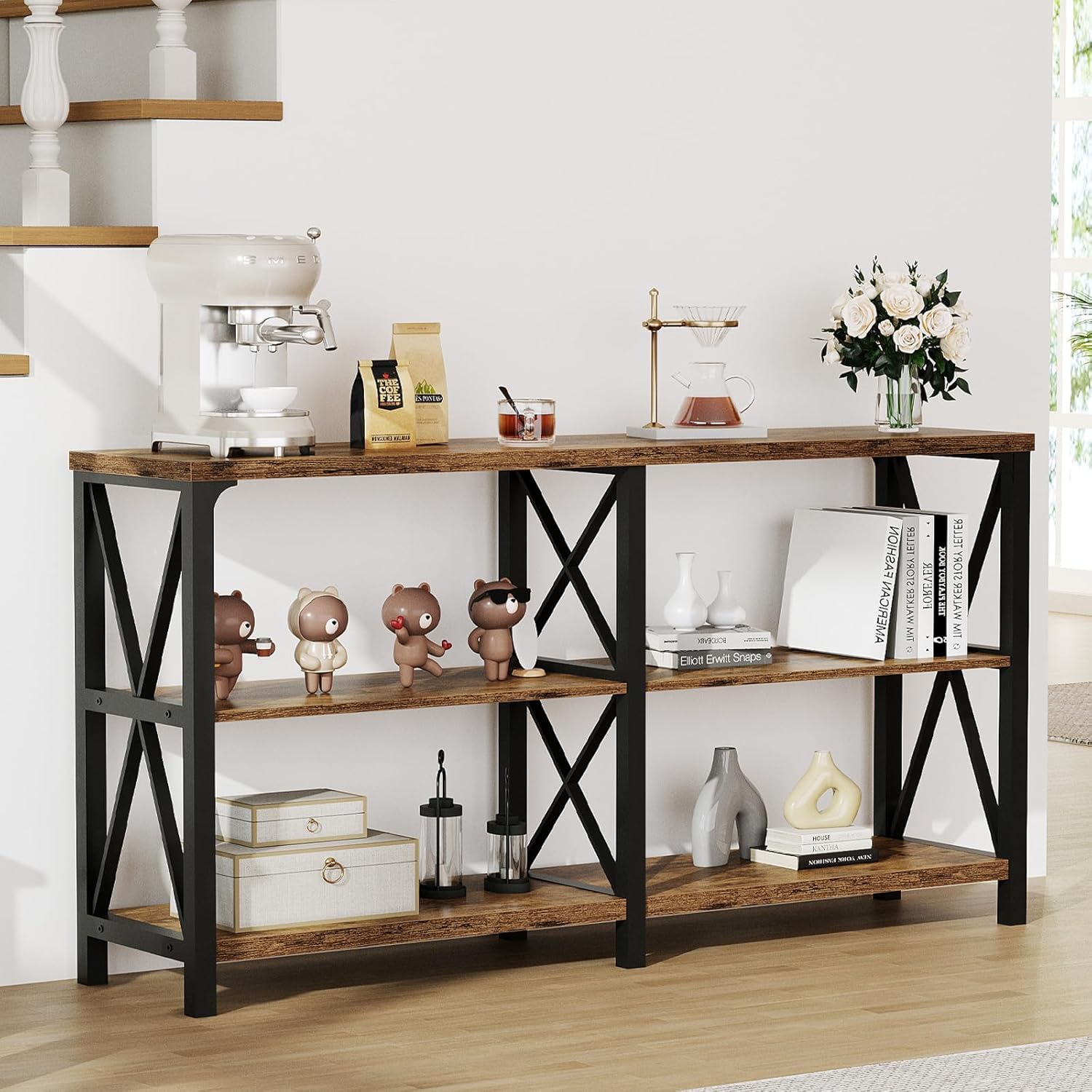 LVB Wood Console Table, Rustic 3 Tier Sofa Table Behind Couch, Industrial Metal Entryway Table with Storage Shelf, Farmhouse Wooden Foyer Hallway Table for Entry Living Room, Rustic Brown, 55 Inch