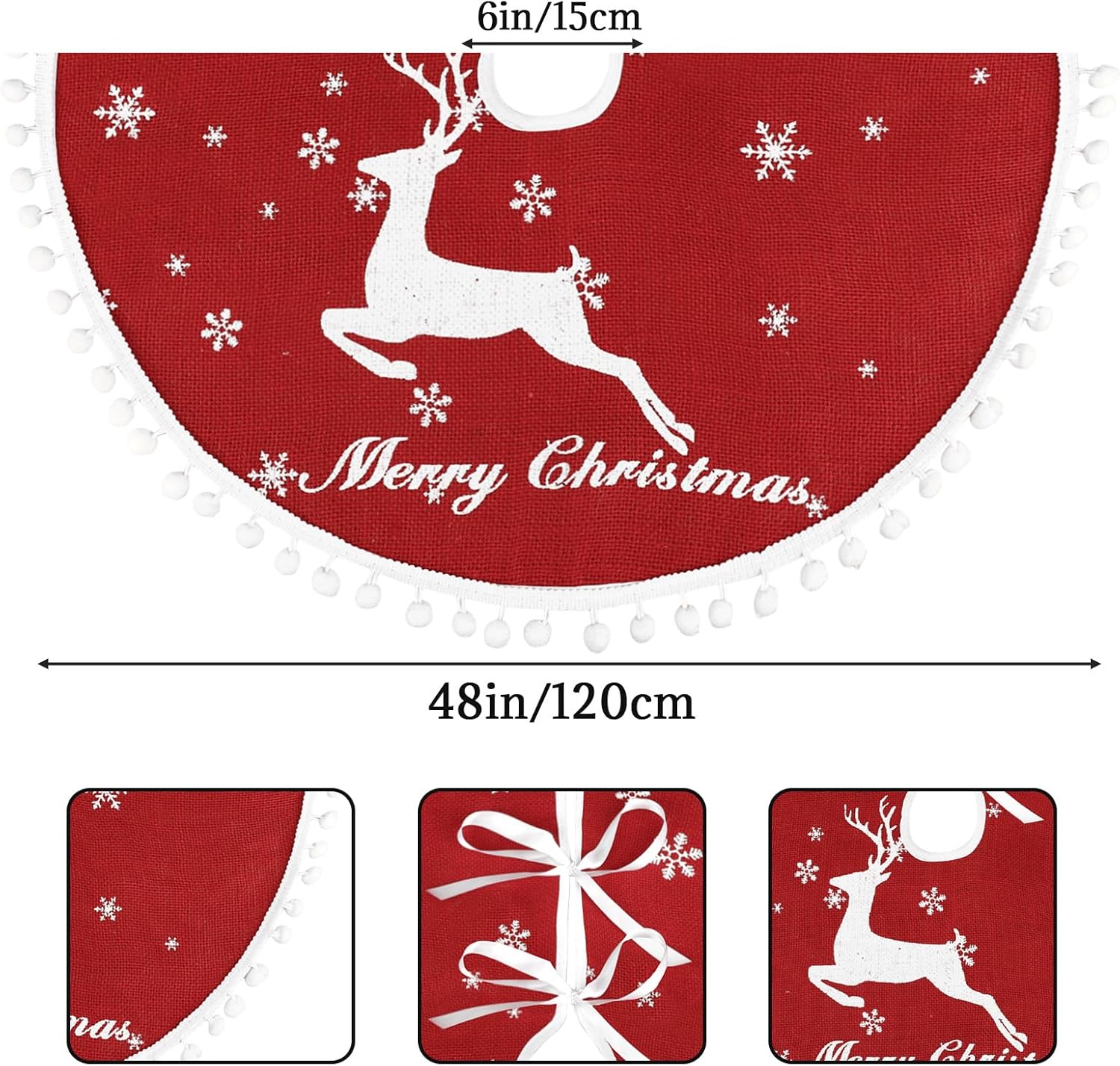 48 Inch Christmas Tree Skirt, Burlap Red Christmas Rustic Tree Skirt with Elk Deer and White Snowflake Printed for Holiday Party Xmas Tree Decoration
