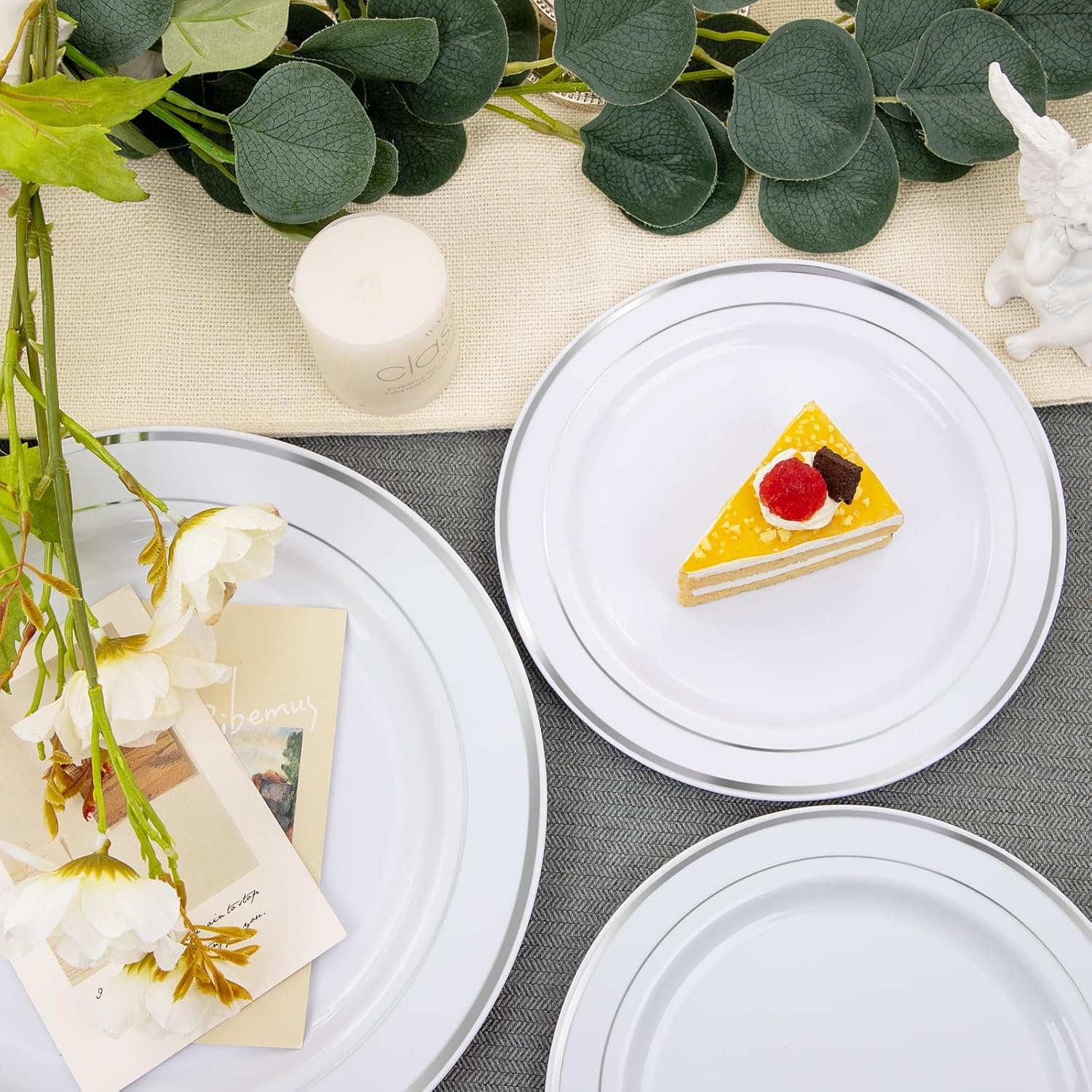 - SPECIAL DESIGN: The white plate set comes with a beautiful silver rim that adds a luxurious touch to your table. These white and silver plastic plates are beautifully designed and will add elegance to your party.