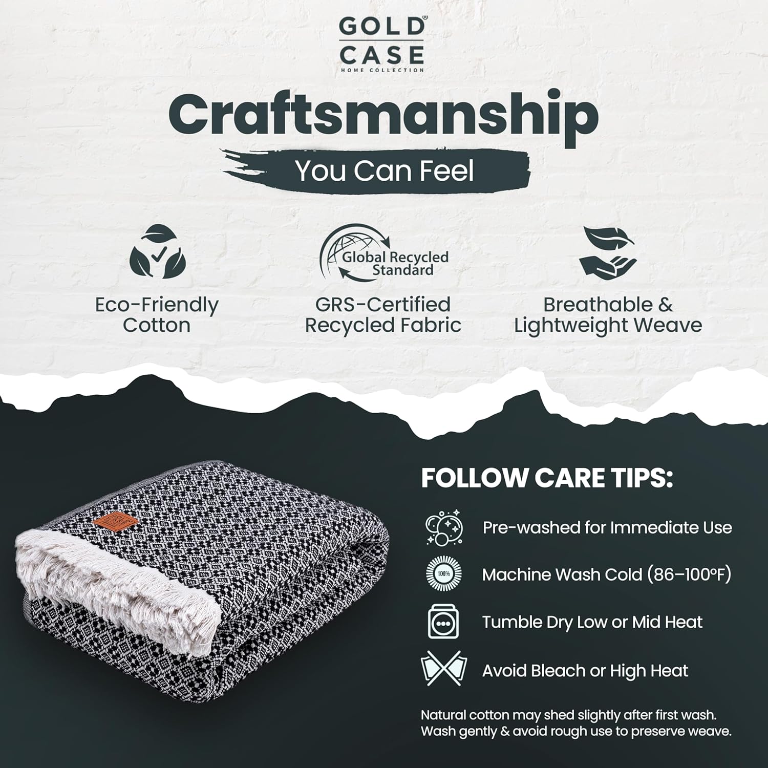 Gold Case Throw Blanket for Bed – 100% Recycled Turkish Cotton Bed Blanket – Decorative Throw Cotton Blankets for Living Room & Bedroom – Retro Black Woven Queen Blankets – 90x90