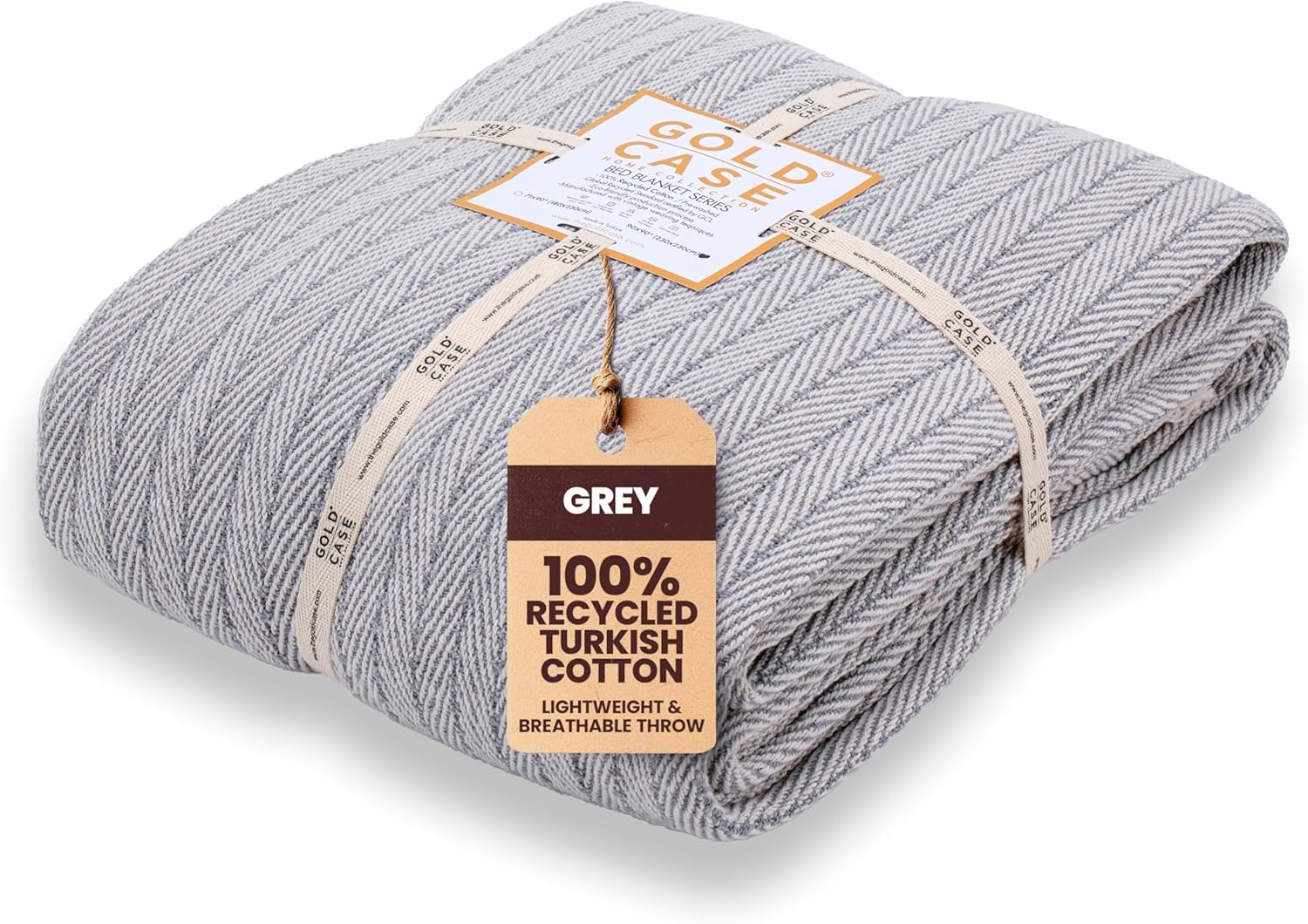 Gold Case Throw Blanket for Bed – 100% Recycled Turkish Cotton Bed Blanket – Decorative Throw Cotton Blankets for Living Room & Bedroom – Vintage Grey Woven Queen Blankets – 90x90