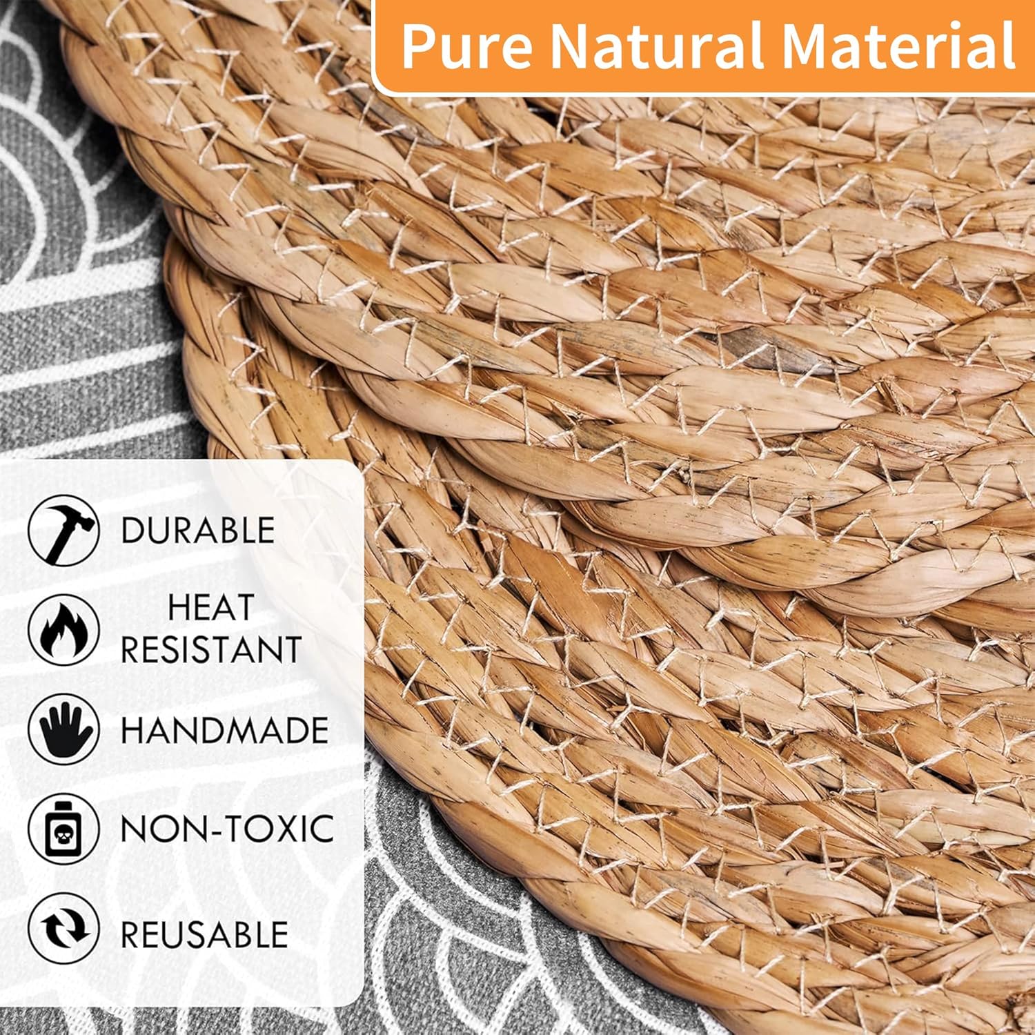 - 【Natural Pastoral Style】:The unique natural pastoral style is your first choice,our woven placemats are carefully handcrafted and made of natural 100% water hyacinth, Because this kind of grass grows on the water surface, the raw material itself will have some dried mold spots, but there are very few, which will not affect the use effect.