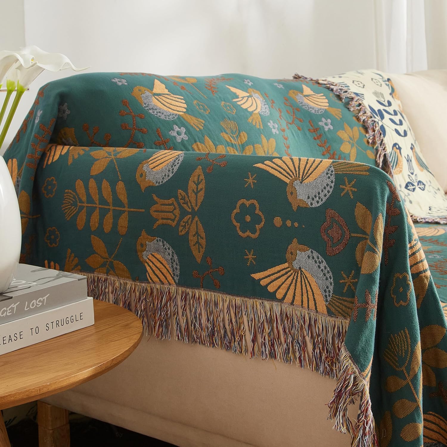 Boho Throw Blanket for Bed 60”x80”, 100% Cotton Woven Blanket for Couch Sofa, Ultra Soft 4-Layer Muslin Quilt with Bird Floral Printed, Farmhouse Bed Blanket/Cover for Living Room Decor