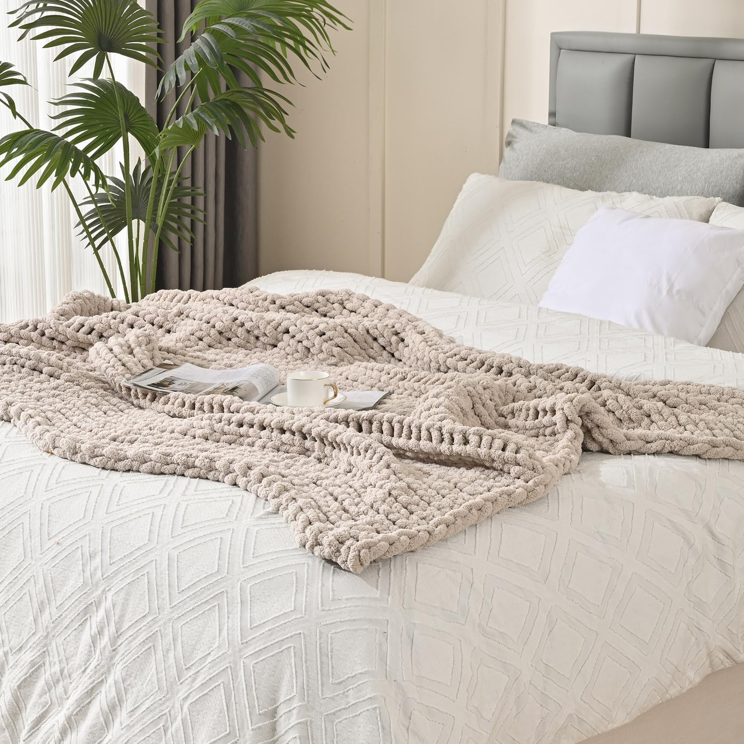 Esterra Chunky Knit Blanket Throw 60"x80", 100% Hand Knitted Chenille Throw Blanket, Cozy Soft Thick Cable Knit Throw Large Rope Knot Crochet Throw Blanket for Sofa Couch Bed, Linen Beige