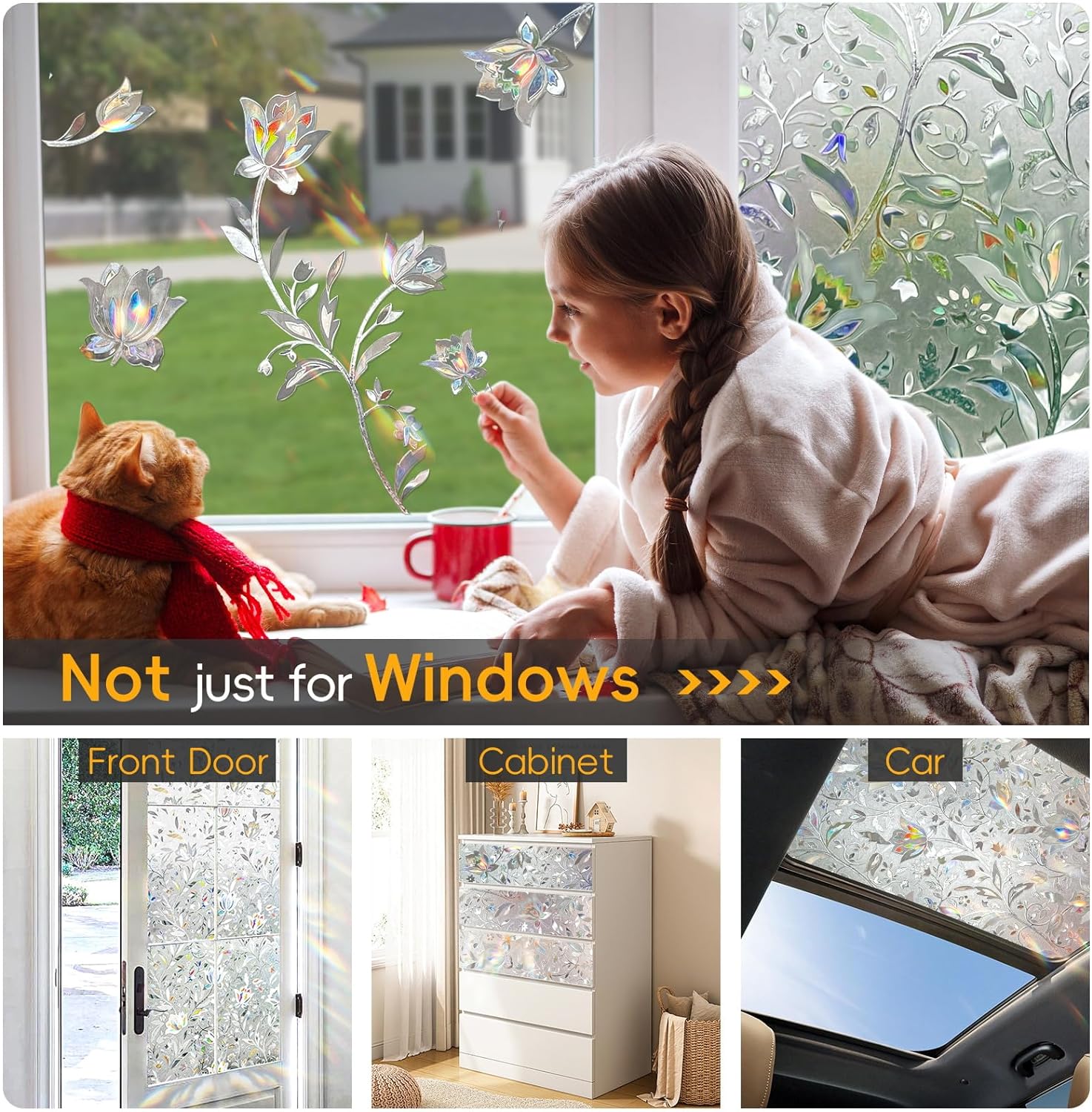 - UV Protection & Energy Saving: Window cling privacy film blocks up to 96% of uv rays. Suncatcher for window reduces most of glares, slowing down fading on flooring, furniture, and protect your beloved one’s skin. Iridescent window film can also cut energy bill up to 50% by rejecting up to 50-90% of total solar energy.