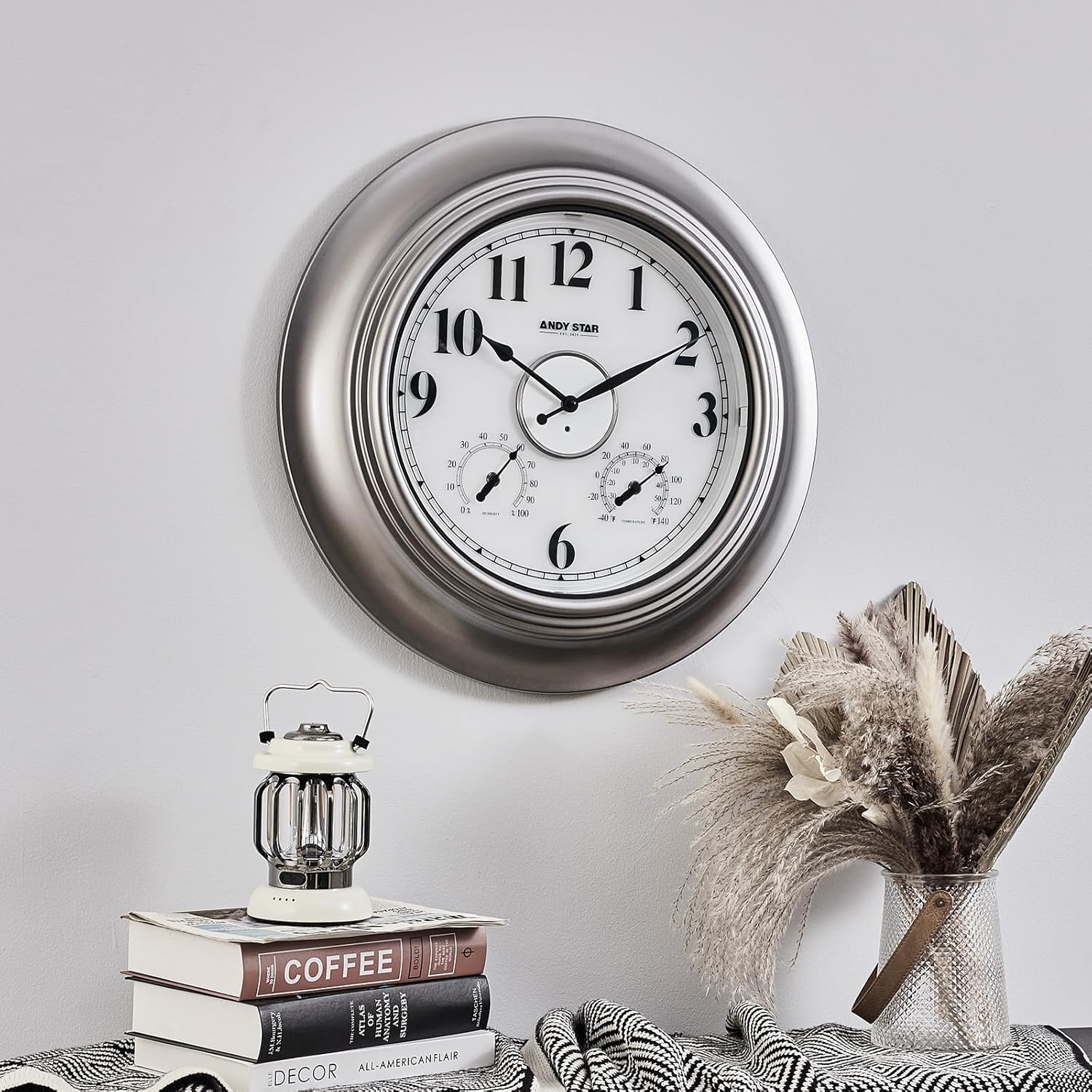 Andy Star 21 Inch Silver Illuminated Outdoor Wall Clock Waterproof with Thermometer and Hygrometer, Oversized Battery Operated Round Wall Clock, Big Silent Non Ticking Clock for Patio Pool Garden