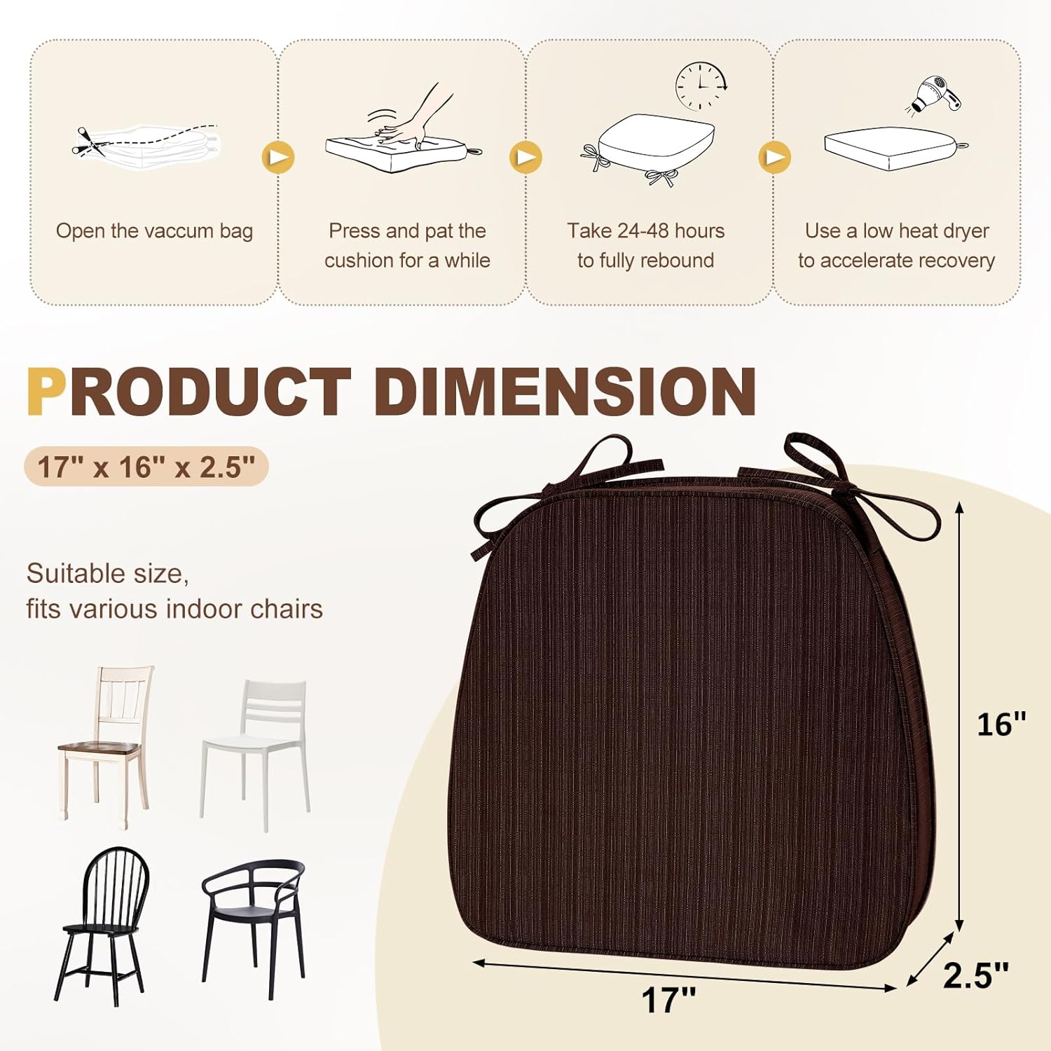 downluxe Chair Cushions for Dining Chairs, Waterproof Kitchen Chair Pads, Non-Slip Dining Seat Cushion with Ties, 17" x 16" x 2.5", Brown, 6 Pack