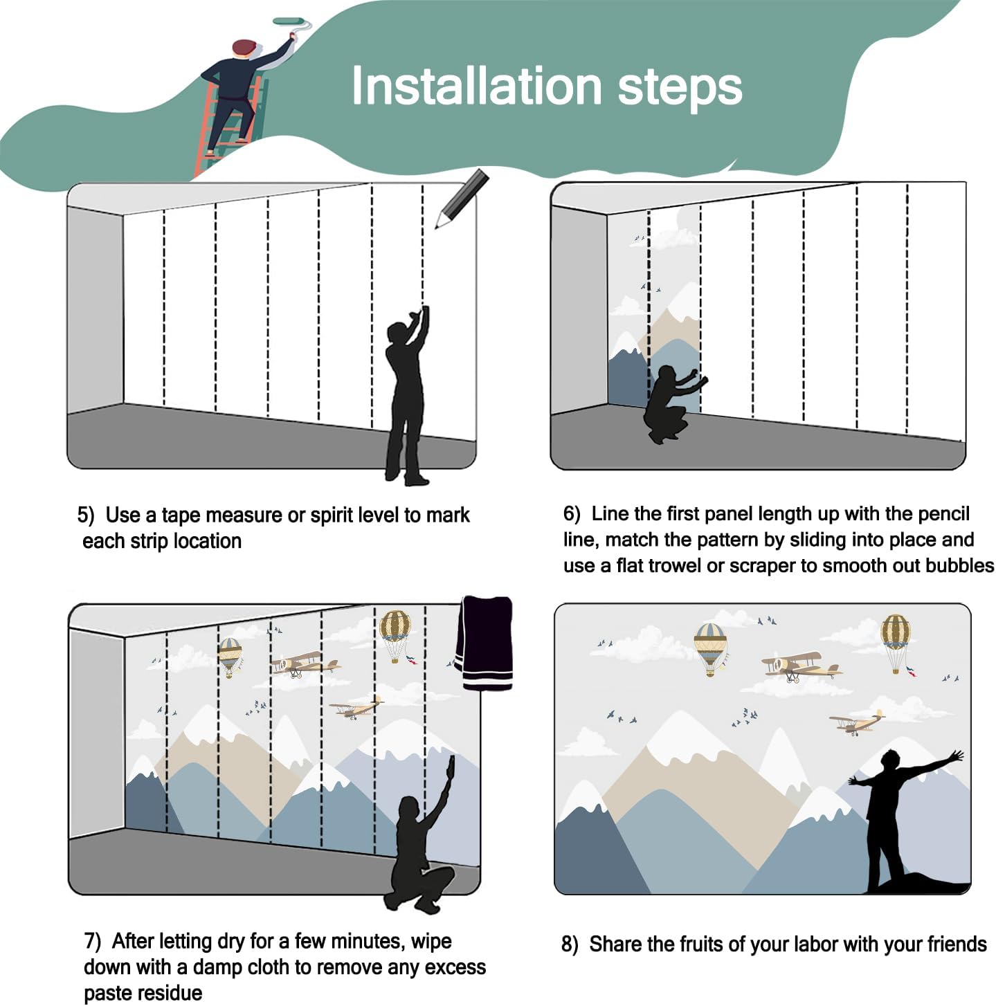 - Mural wallpaper size: 140 "W x 91 "H, divided into 7 sections, each section is labeled with a number underneath, there is no need to overlap the pattern when installing, just install according to the number labeled underneath the panel