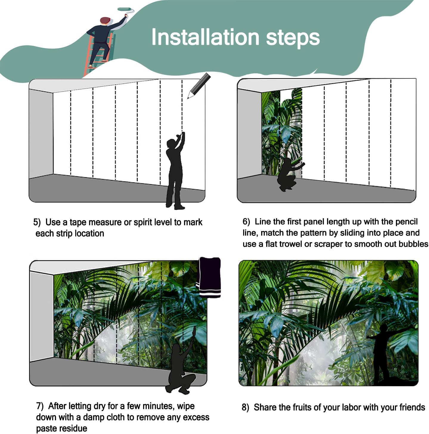 - Mural wallpaper size: 100 "W x 65 "H, divided into 5 sections, each section is labeled with a number underneath, there is no need to overlap the pattern when installing, just install according to the number labeled underneath the panel