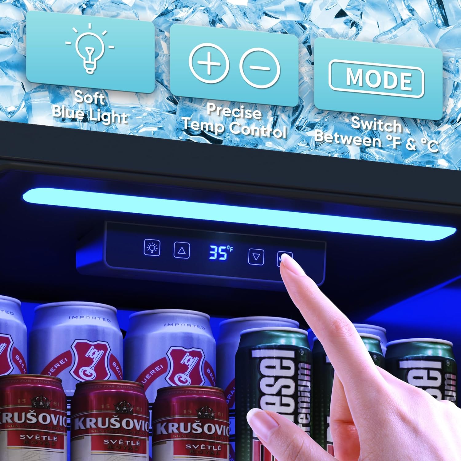 - [Simple & Intelligent Control System] Our Beverage Refrigerator features a user-friendly touch panel that allows for easy temperature adjustment. With a temperature range of 35-65°F (2-18°C), you can easily customize the temperature to your liking (55°F is often cited as close to perfect). To accommodate your usage preferences, we have also added a MODE button. This allows you to toggle between Fahrenheit and Celsius temperatures.There's also an LED light that comes on at the touch of a button.