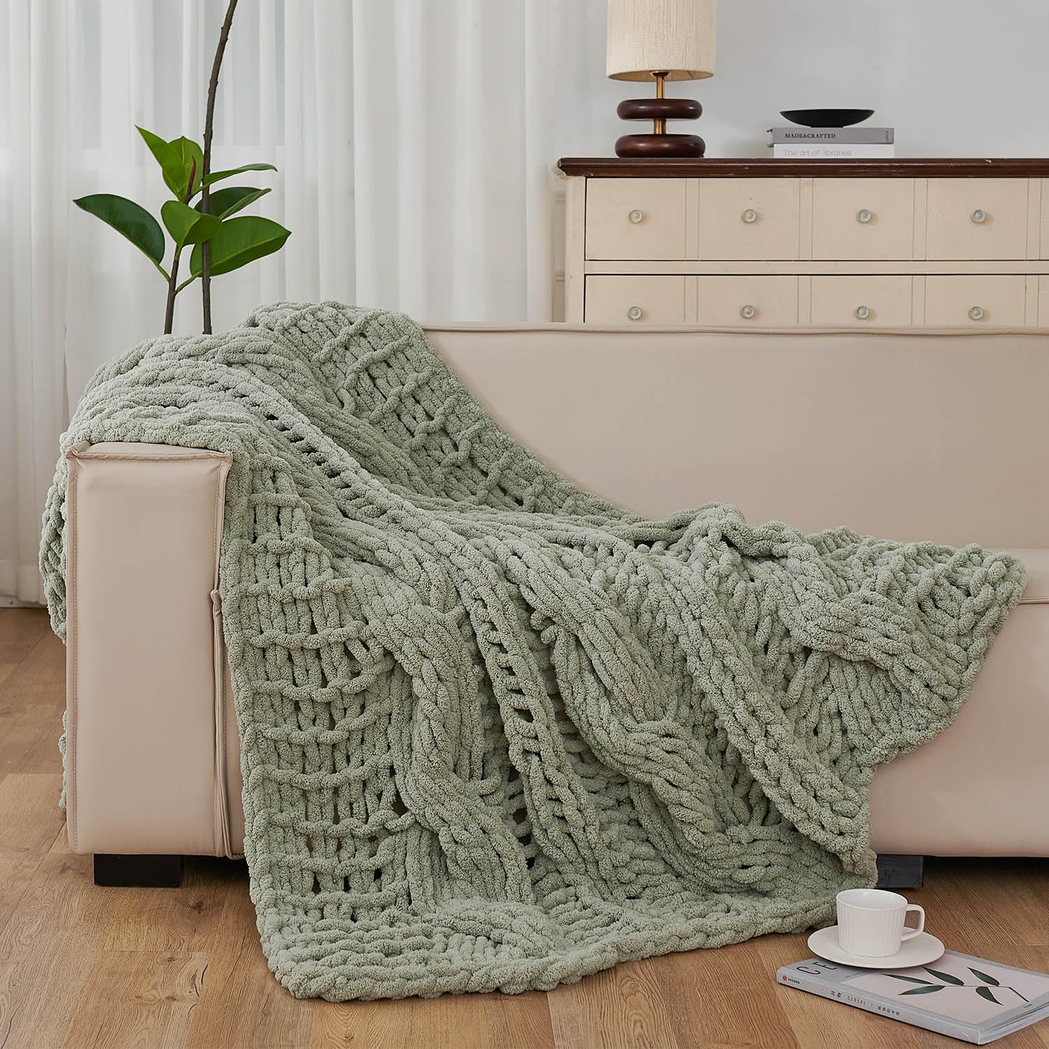 Esterra Chunky Knit Blanket Throw 50"x60", 100% Hand Knitted Chenille Throw Blanket, Cozy Soft Thick Cable Knit Throw Large Rope Knot Crochet Throw Blanket for Sofa Couch Bed, Sage Green