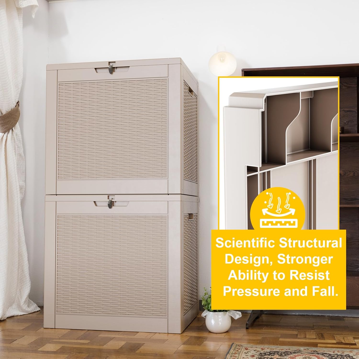 - ๐๐ฎ๐ซ๐๐๐ฅ๐ ๐๐๐ญ๐๐ซ๐ข๐๐ฅ - Made from high-quality resin material, this deck box provides unyielding protection for your belongings. With up to 1000 SGS UV protection, your outdoor storage box will never warp, fade, or crack. It withstands harsh weather, intense sunlight, and cold climates. Whether it's the sun-drenched summer or the stormy winter, your items will be safely stored, remaining in pristine condition.