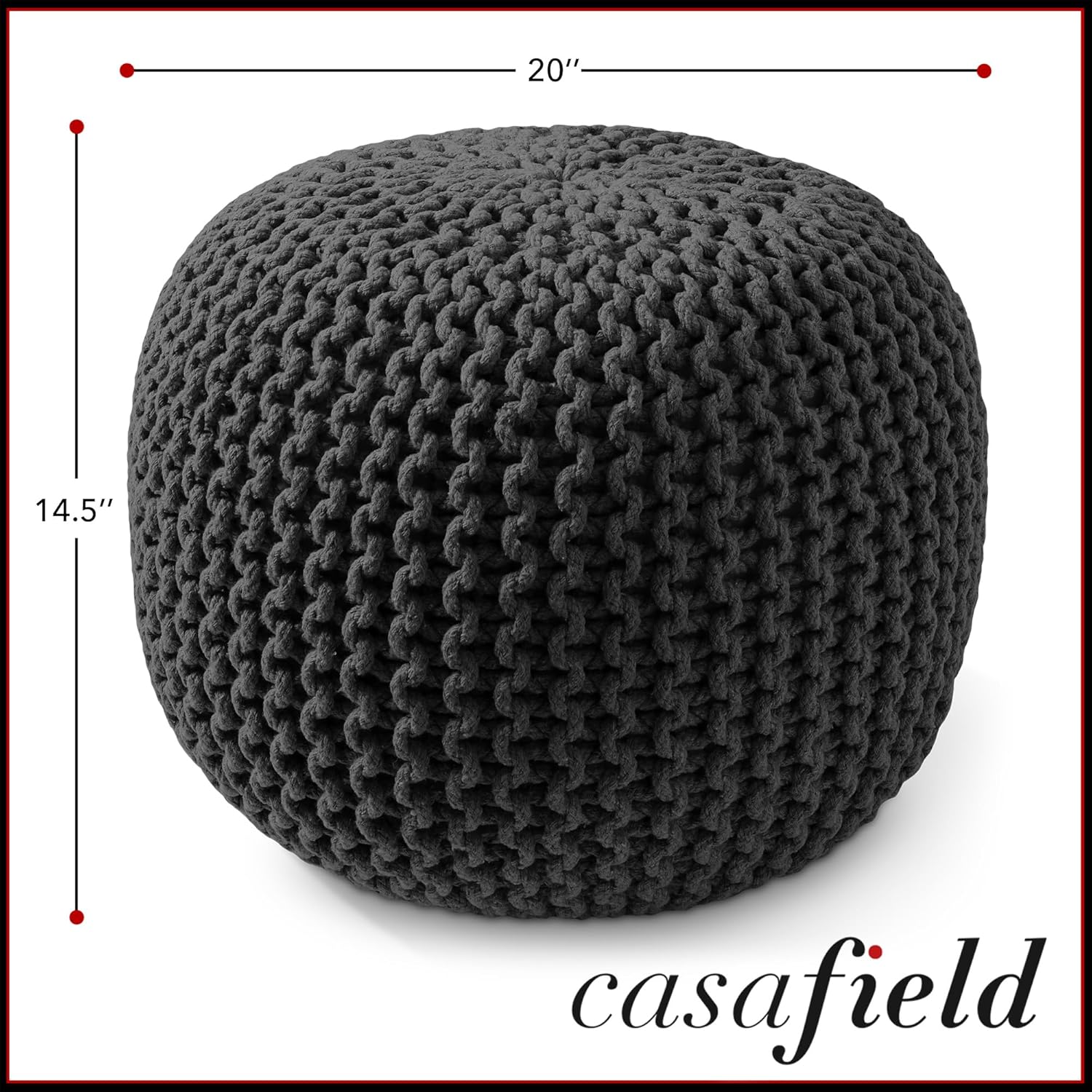 Casafield Round Pouf Ottoman, Black - 20" Diameter x 14.5" High Cotton Knit Foot Stool - Boho Floor Pouffe for Living Room, Bedroom, Home Office