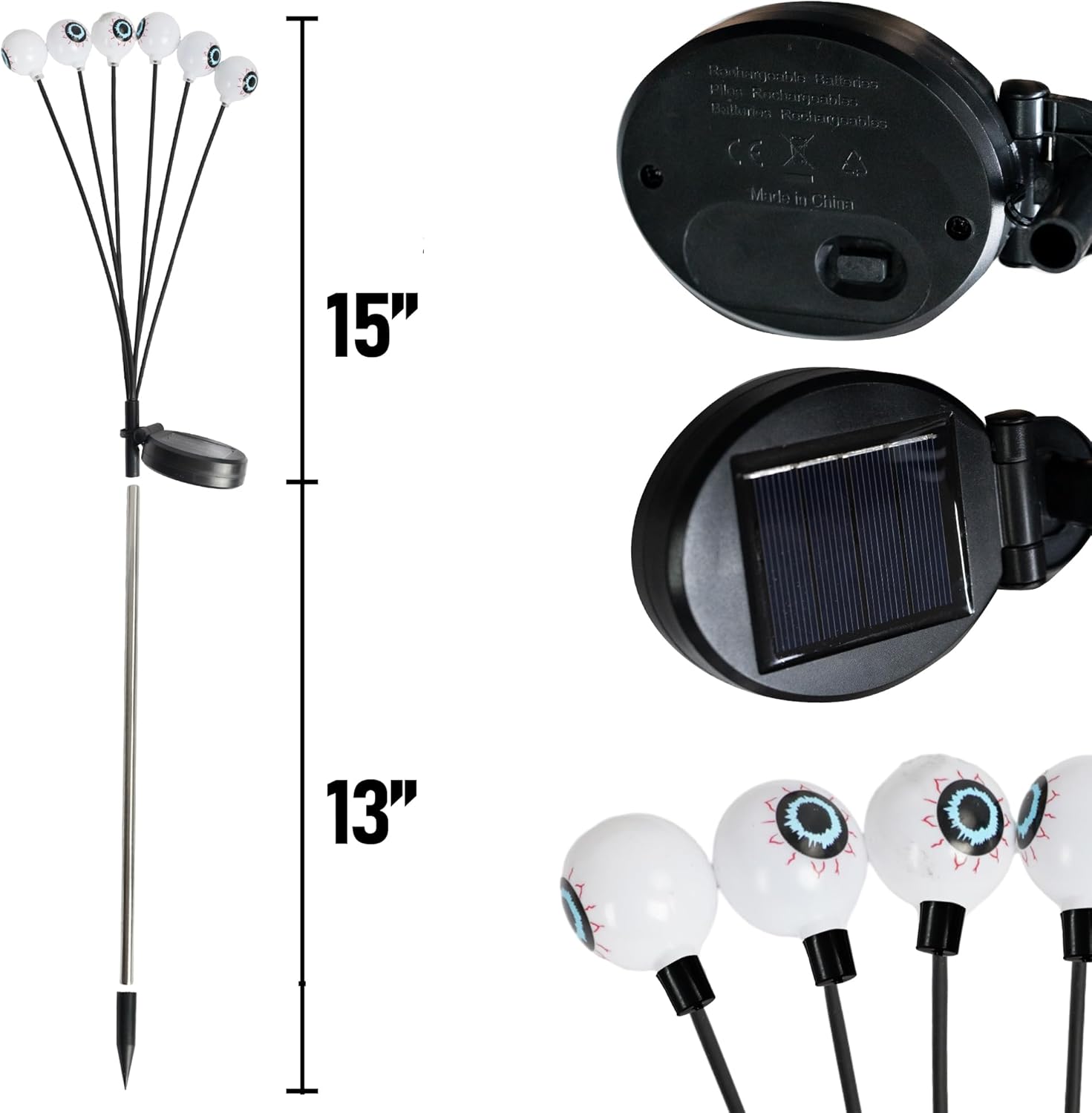 - Easy to Install: Divided into 2 parts, the upper part is eyeball decoration and solar panels, and the lower part is a bracket. Put it all together.