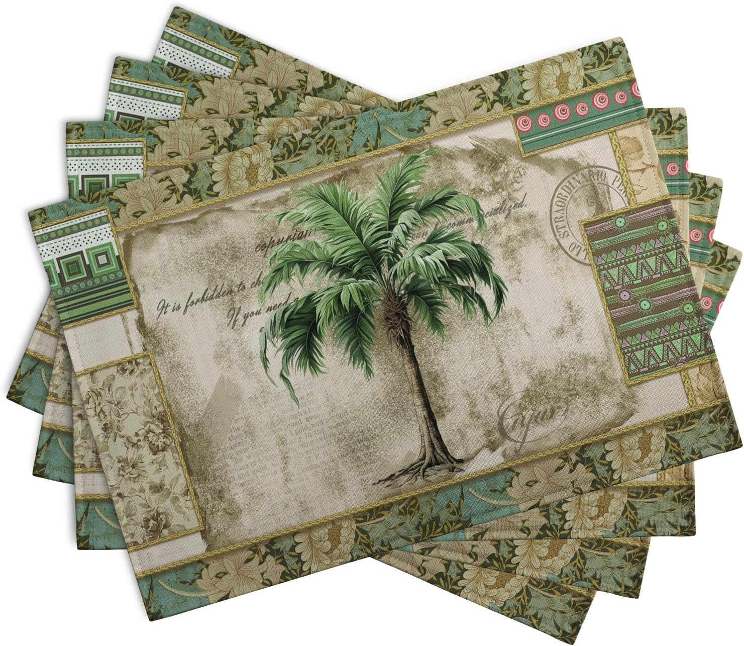 Tropical Palm Tree Placemats Set of 4 Summer Vintage Green Leaf Kitchen Table Mat 12x18 Inch Hawaii Beach Jungle Plant Tree Heat Resistant Washable Linen Place Mats for Dining Tables