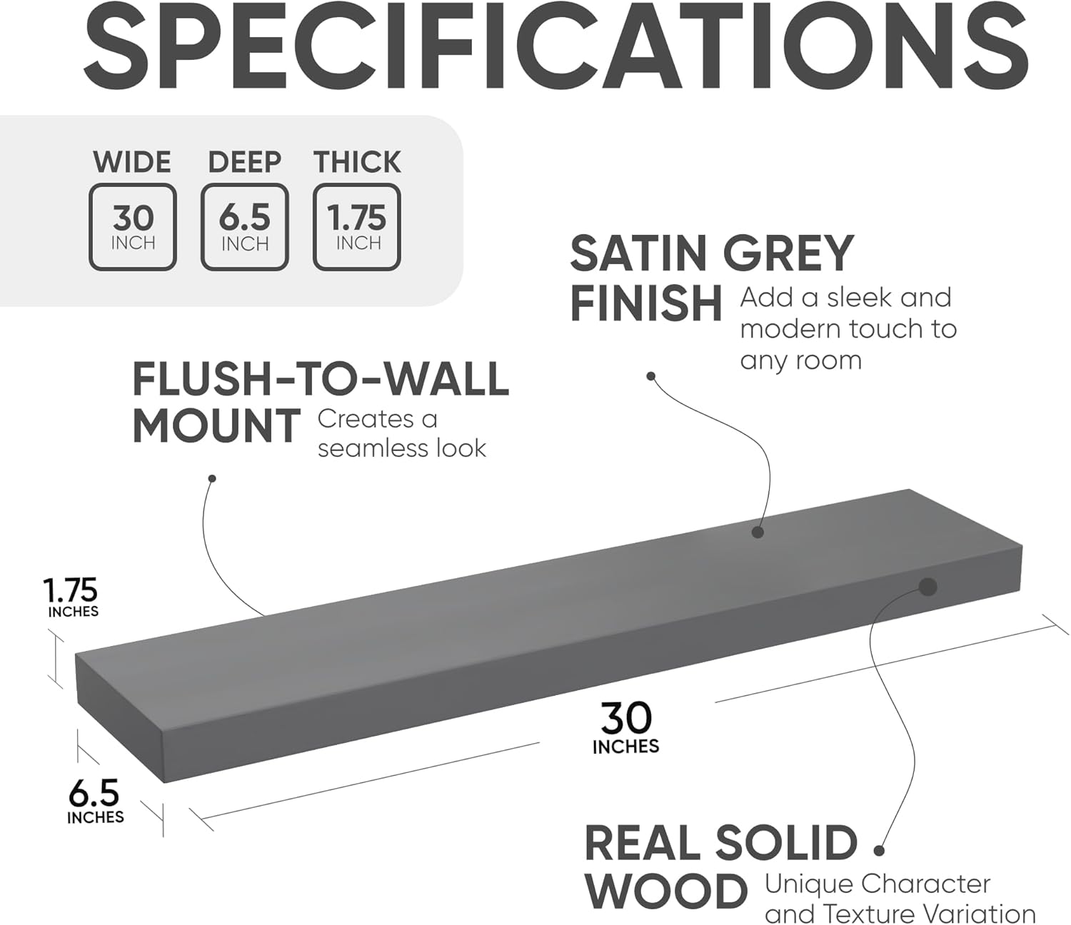- AUTHENTIC WOOD GRAIN - Enjoy the timeless elegance of real wood. Handcrafted from the finest 1.75" Thick natural pine wood measuring 30" Wide x 6.5" Deep x 1.75". Our shelves highlight the inherent charm and durability of high-quality wood. Each Shelf reveals its unique character of knots and natural wood grain; each ledge is a little different but equally stunning.