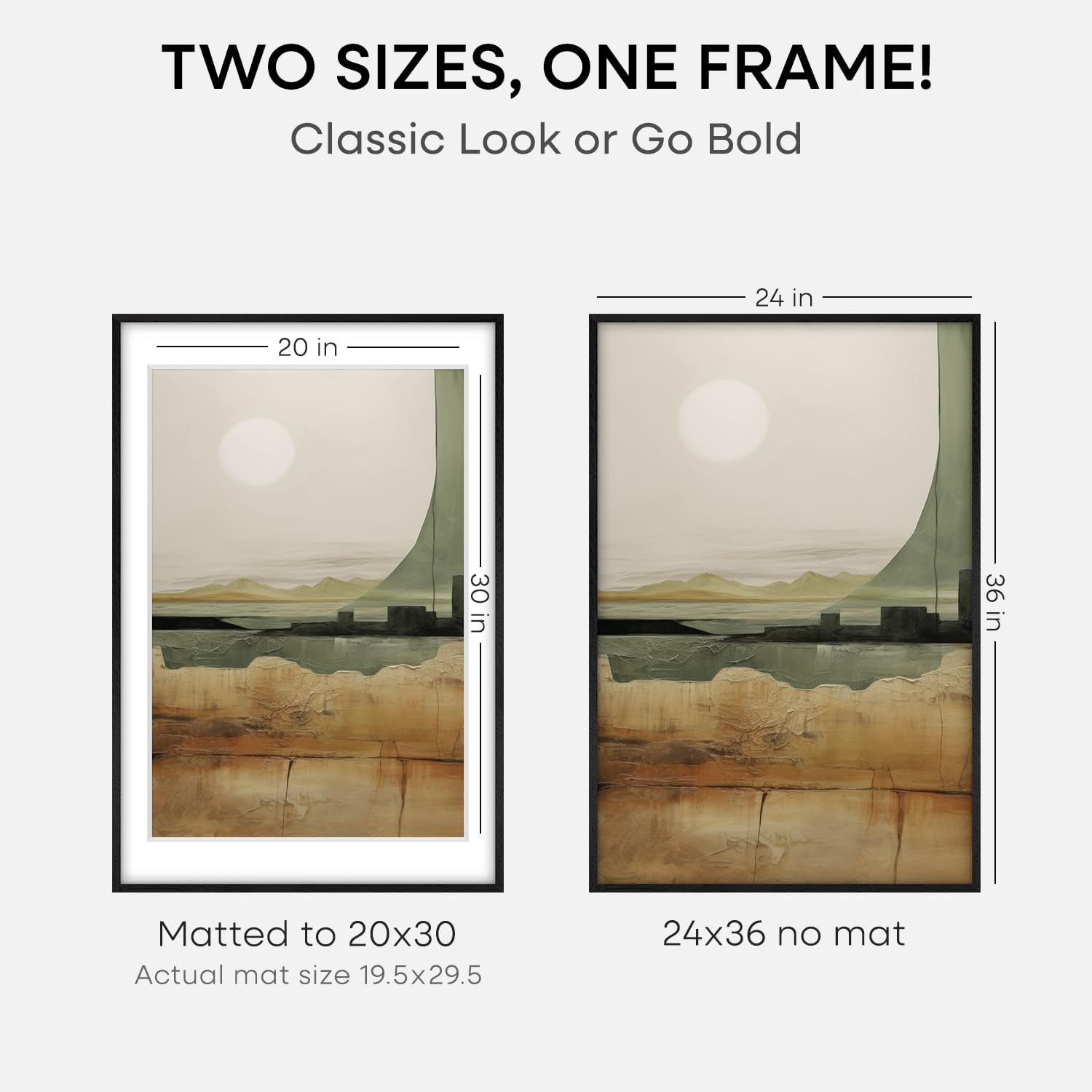 - MATTED OR EDGE-TO-EDGE—YOUR CALL. A crisp 20x30 white mat creates negative space, elevating your image with gallery precision. Or remove it for 24x36 bold, uninterrupted impact.
