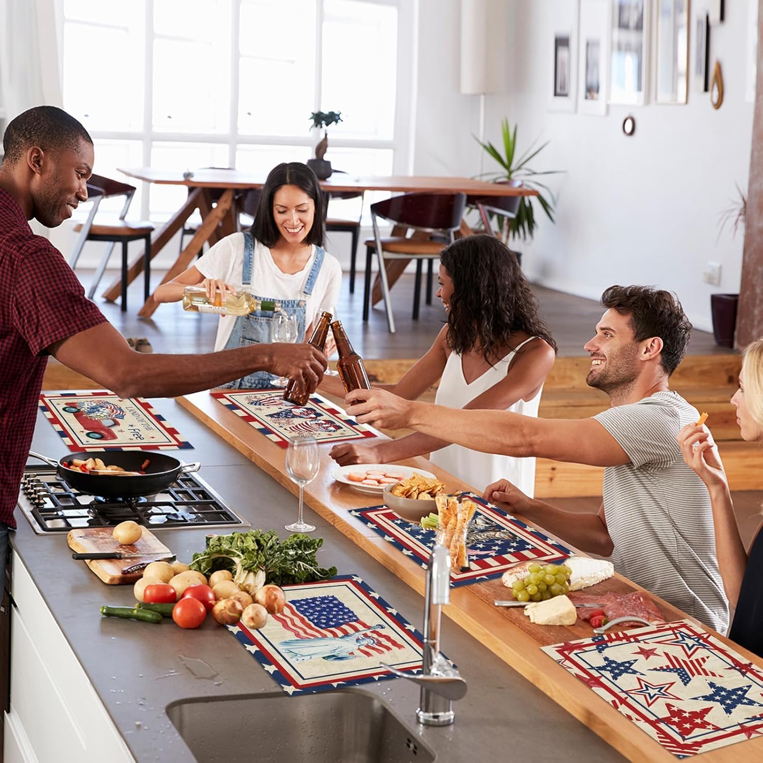 - Thoughtful design: 4th of july placemats set of 6, each with four rounded corners protects you from being hurt by the sharp angles. The design of the 4th of July plastic kitchen dining placemats feature the vintage design and printed with American flag, truck, gnomes and boots patterns. Impress your guests and create an unforgettable and warm atmosphere for your party.