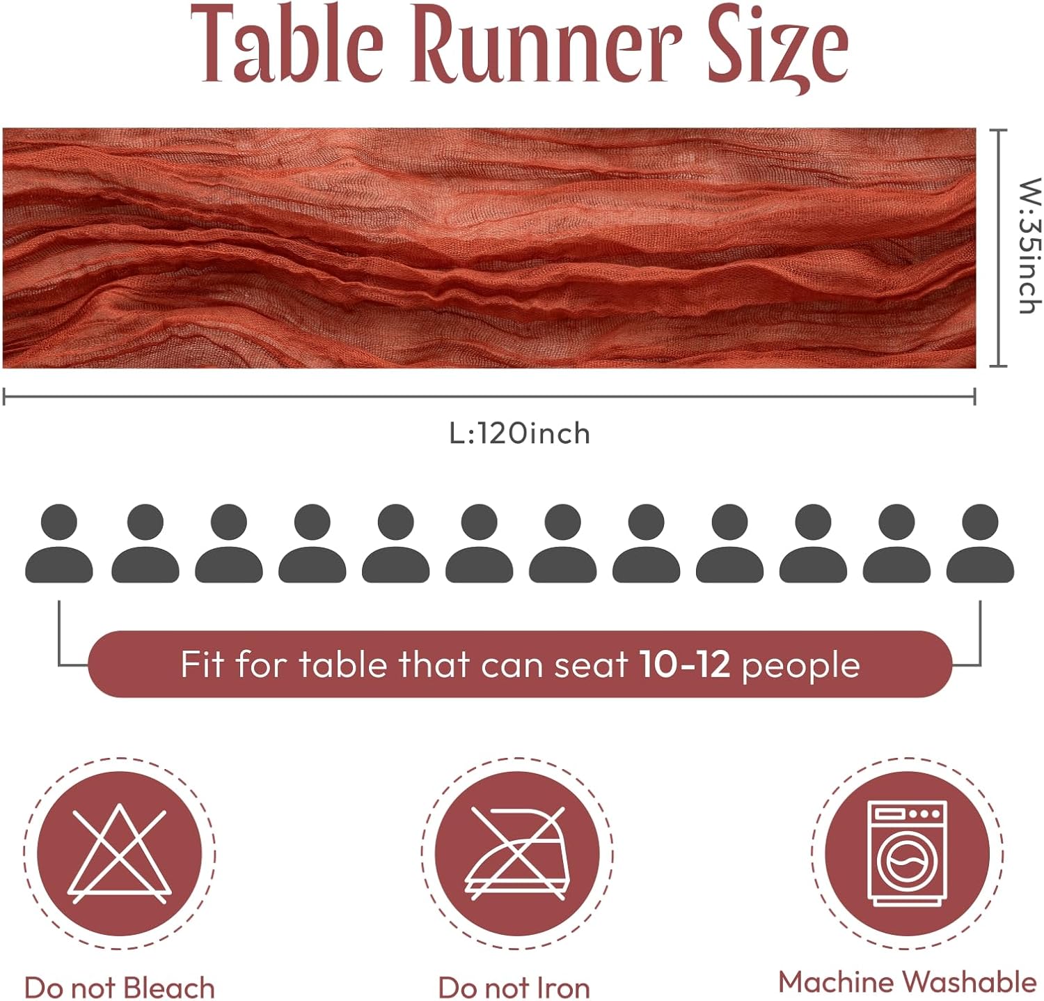 - 【Package Includs】1pcs Cheesecloth table runner (35" W x 120" L), neatly packed in a transparent plastic bag. This versatile table runner is specifically designed to fit most types of tables.