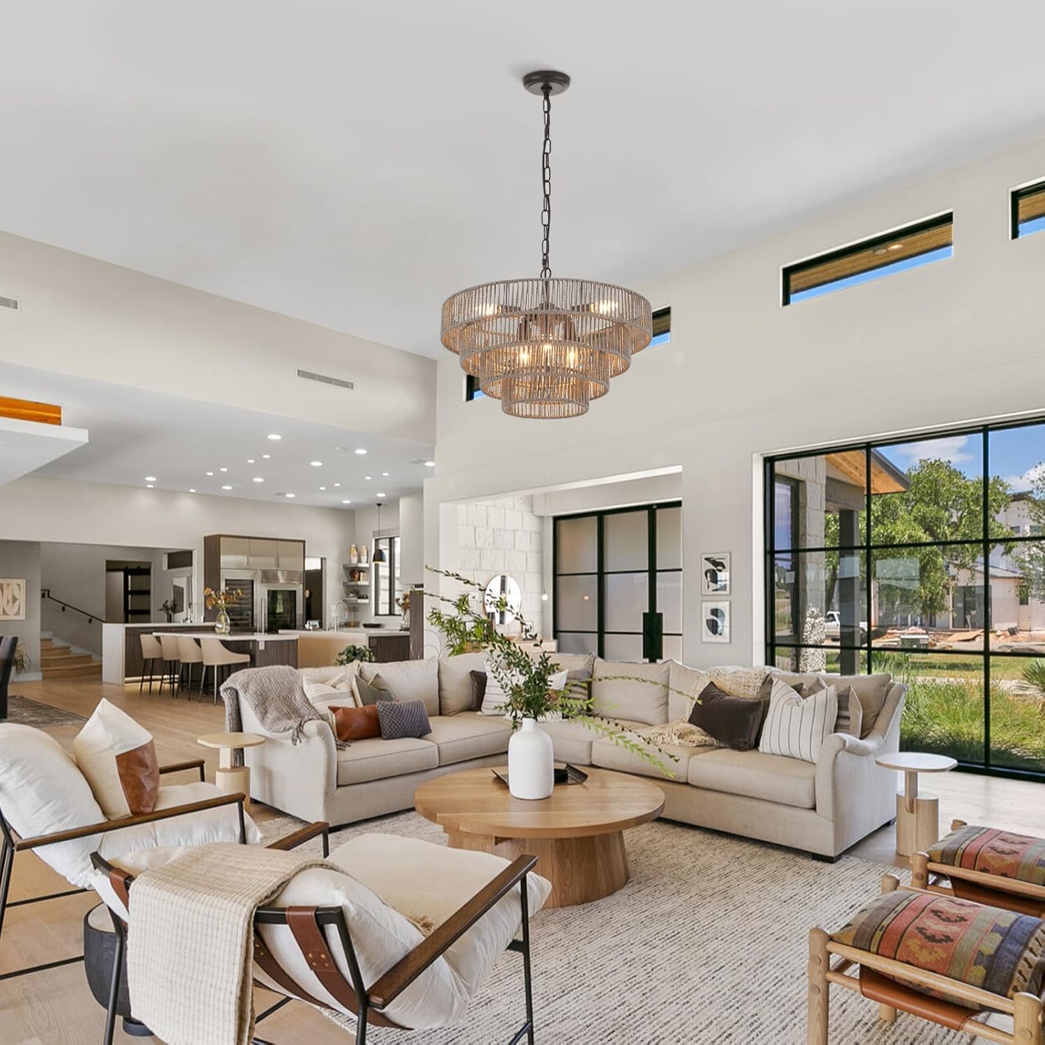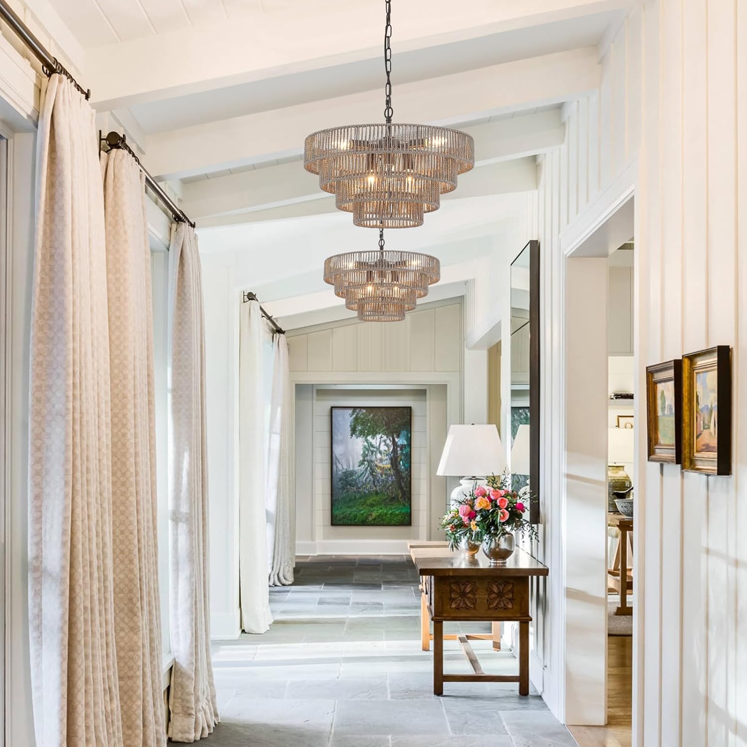 - Wide Application: This farmhouse chandelier is ideal for kitchen, kitchen island, dining room, living room, hallway, walk-in closet, restaurant, etc. Ideal: 150-260 square feet (for reference ONLY), Can pair with LED or higher wattage bulbs (10w each max) or purchase 2 or more or other auxiliary light sources for brighter or larger space.