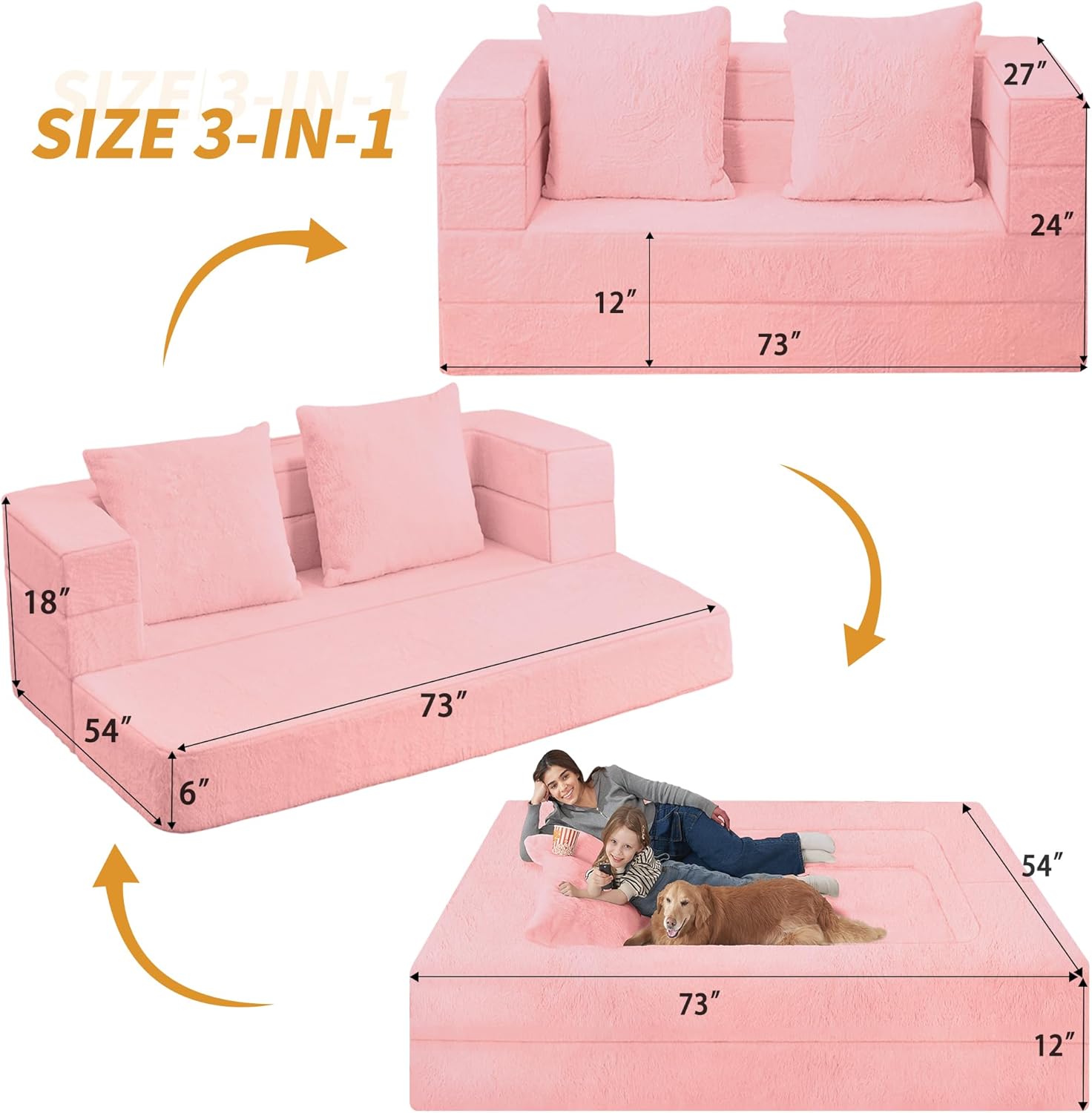 Folding Bean Bag Chair for Adults,3-in-1 Bean Bag Couch Faux Fur Floor Sofa Large Beanbag Convertible Bean Bag Sofa Bed with Pillow in Bedroom,Living Room,Apartment(Queen,Pink)