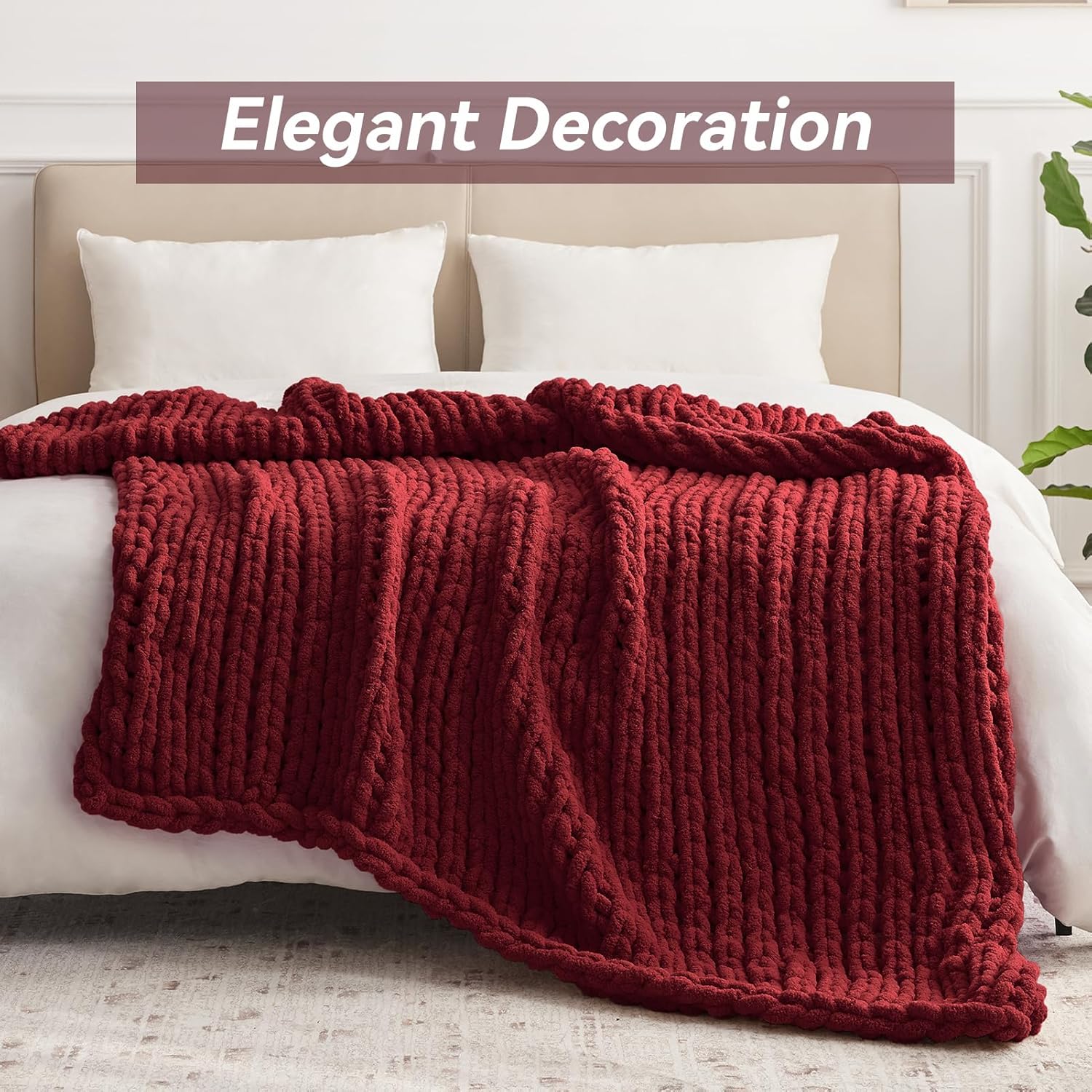 Chunky Knit Throw Blanket, 50''*60'' Knitted Throw Chenille Yarn for Bed Couch, Handmade Red Crochet Big Thick Blanket, Machine Washable Cute Comfy Blanket for Home Decor