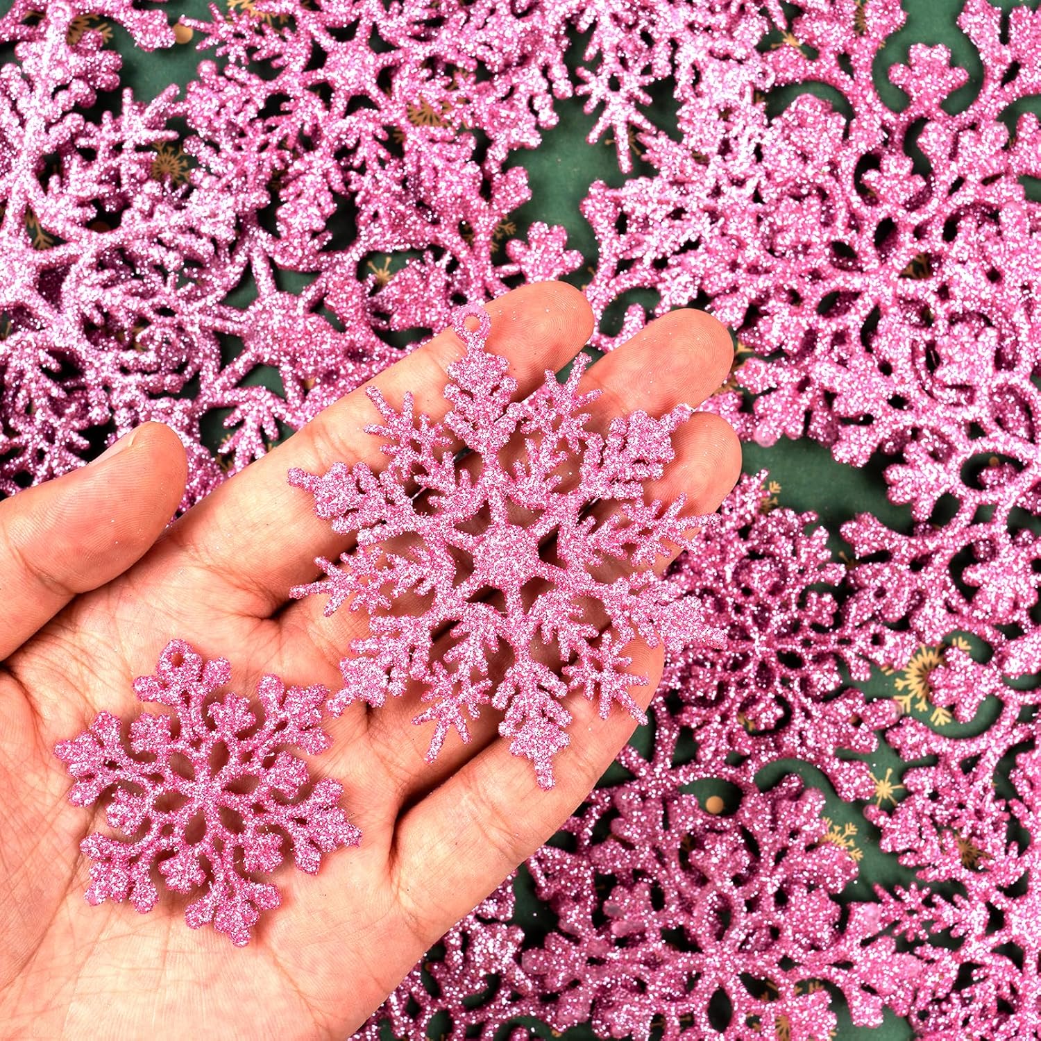 - SNOWFLAKES OF VARIED SIZES: A value pack of 36pcs light pink Christmas glitter snowflakes in 4 varied sizes and 2 different patterns: 8pcs for 4.2 inch for both styles, 10pcs for 3 inch and 10pcs for 1.8 inch. It’s a lot of snowflakes sufficient for your Christmas decorations.