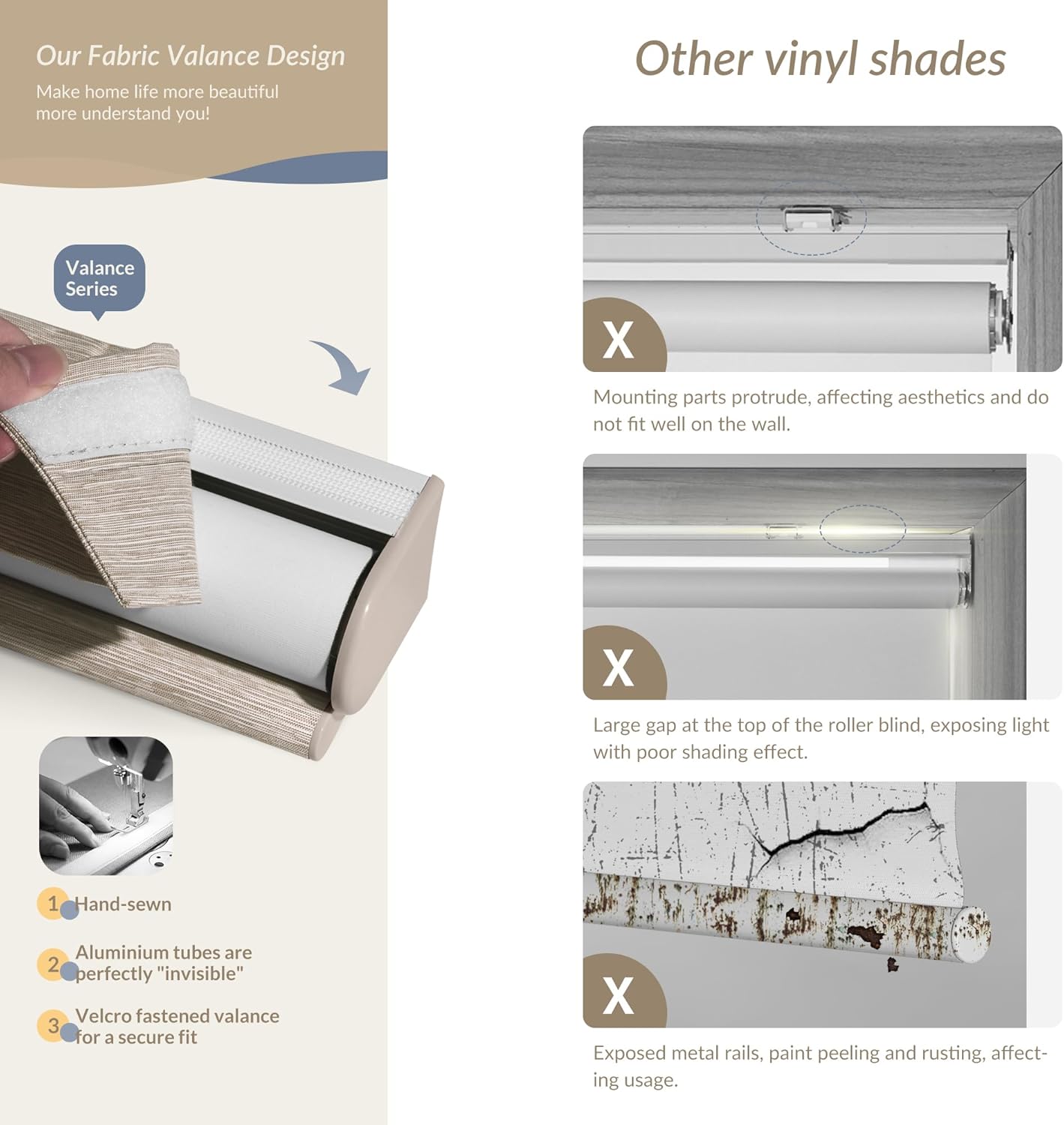 - [Valance Blackout Design, Luxurious and Elegant] Blackout roller shades add an extra layer of hand-stitched valance using fabric to effectively cover the seams of the top rail and reduce light leaks. Give you an excellent light-blocking experience. While the product as a whole using fabric wrapped, uniform color scheme, like a work of art.